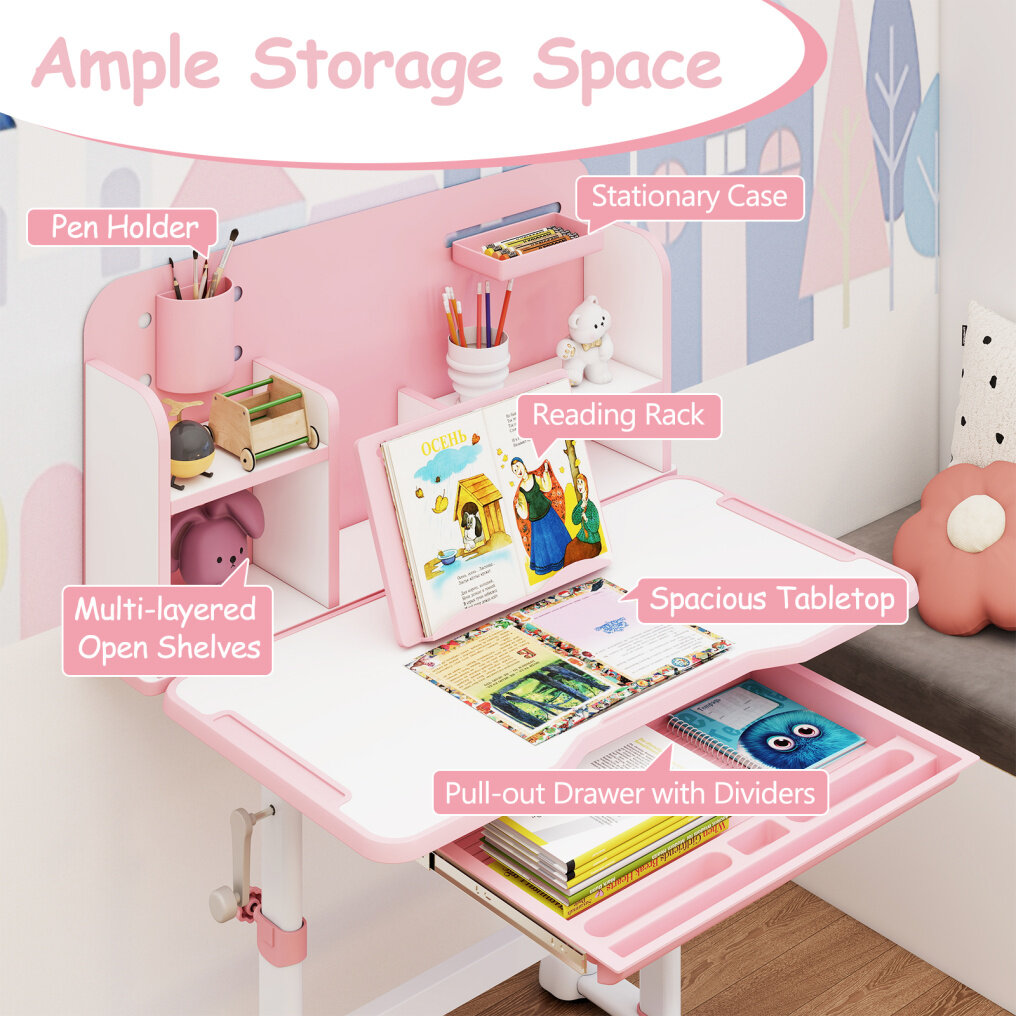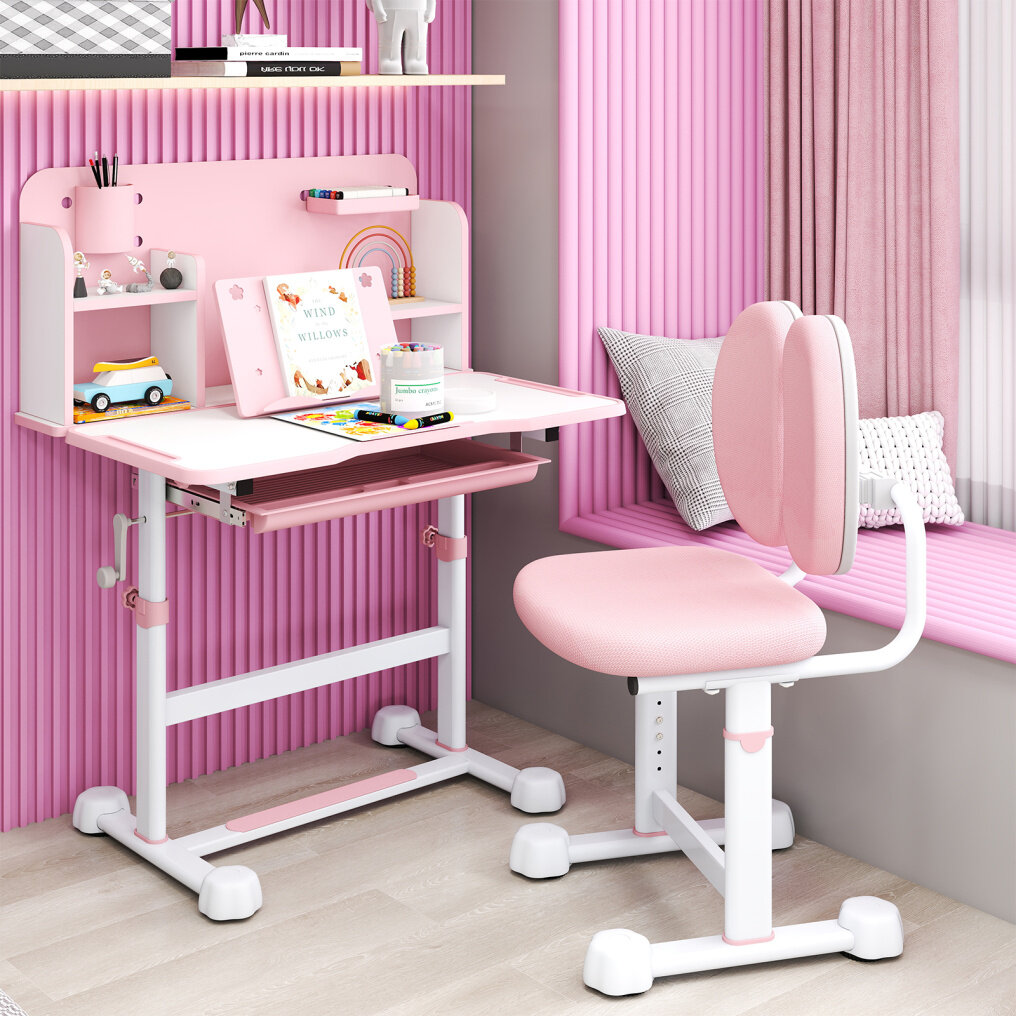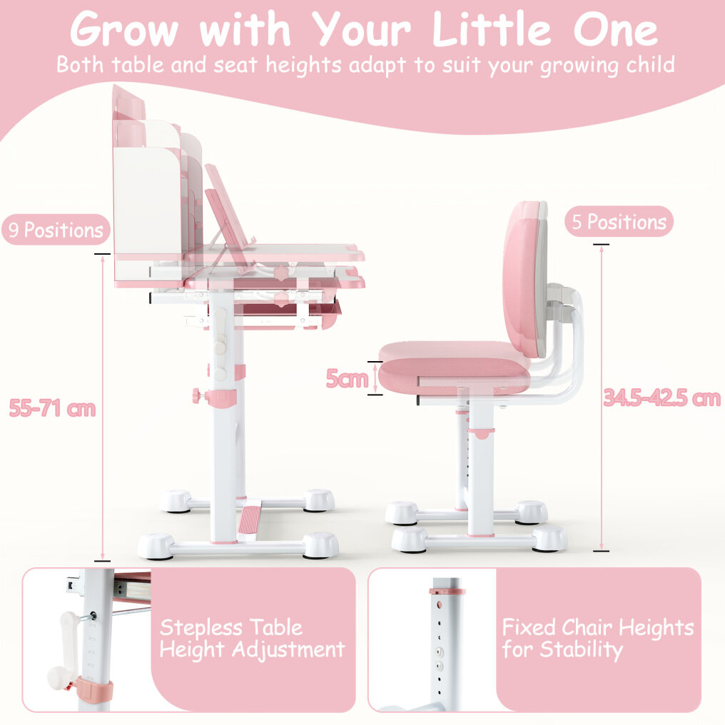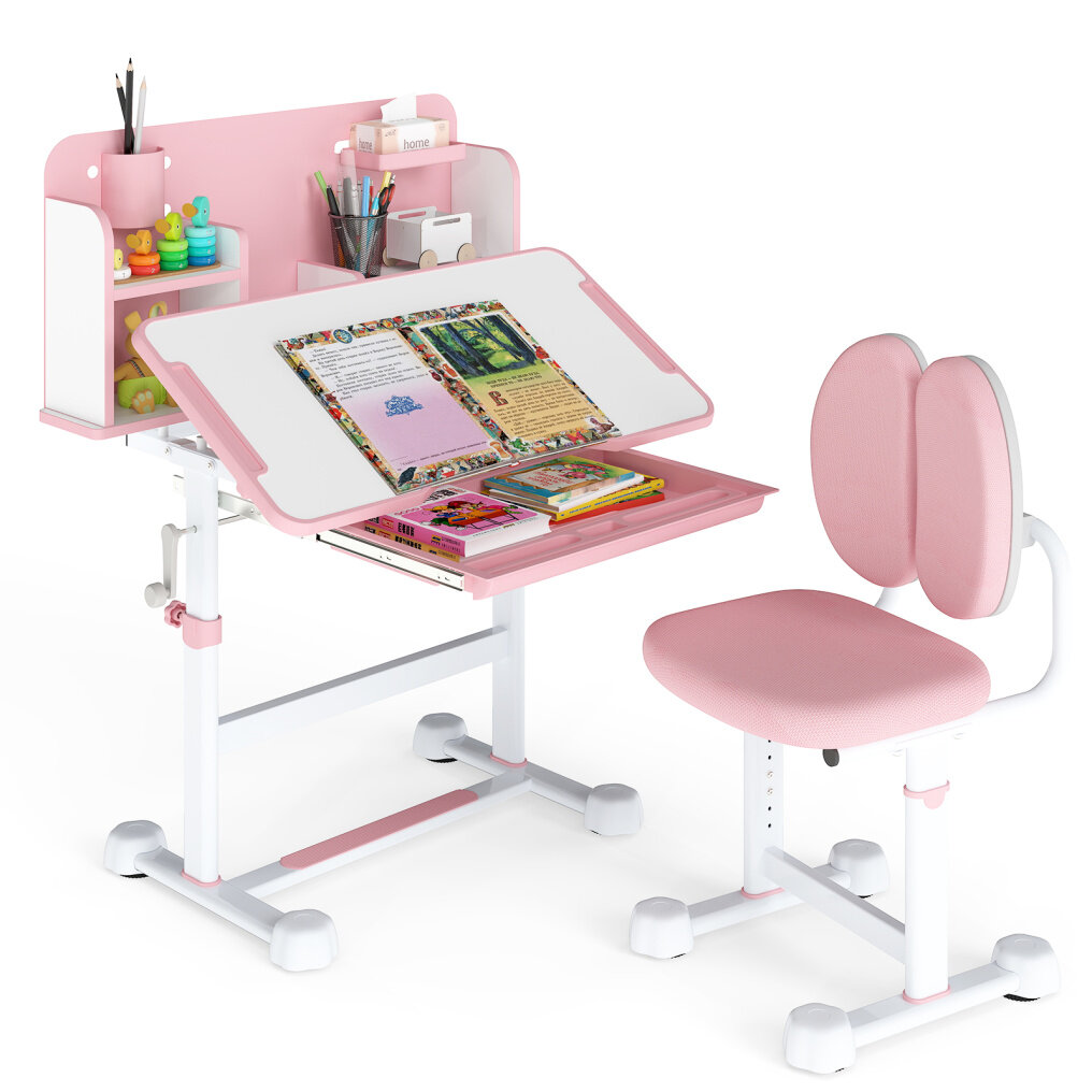 Adjustable Height for Growing Kids: The table can be adjusted in 9 positions, while the chair can be fixed in 5 positions, which will accompany your little one to grow up. The hand crank makes it easy to raise or lower the study desk.