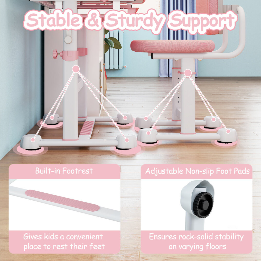 Convenient and Considerate Features: The footrest bar allows kids to rest their legs for relaxation. The rounded corners and edges avoid accidental bumping or scratching for safe use. Additionally, the adjustable foot pads keep the desk and chair steady and stable.