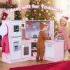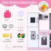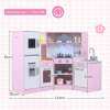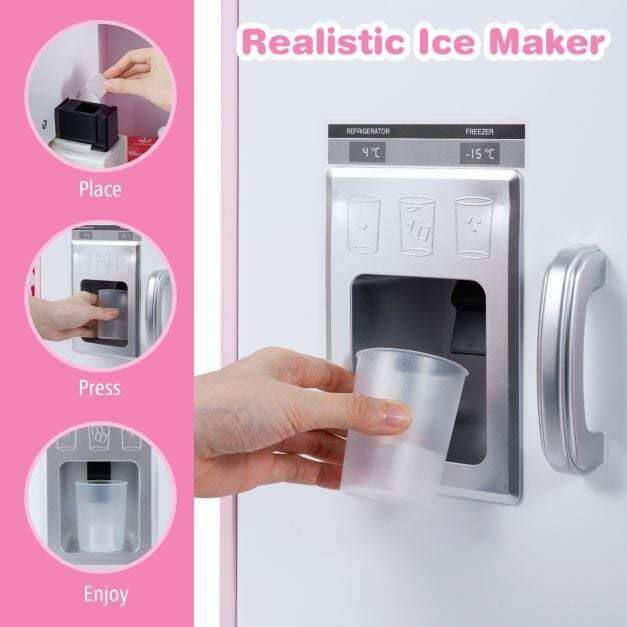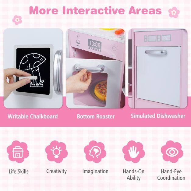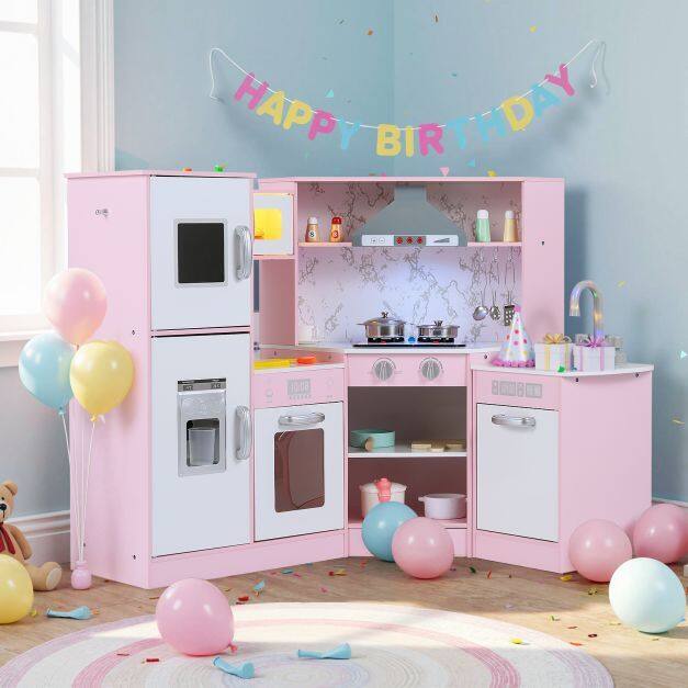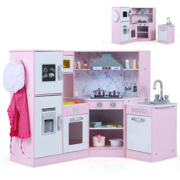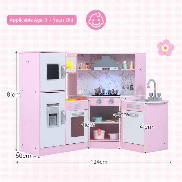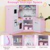 Our toy kitchen set for kids features realistic sound and light effects on the microwave, range hood, separate sink, and stove. This play kitchen also has multiple interactive areas, including an ice maker, chalkboard, and rotating knobs. Kids can pretend to wash, cook, light, or cook. It also features one side hook, one top shelf, two bottom shelves, and three utensil hooks for kids to store kitchen accessories. Thanks to its angled design, it can be placed anywhere in the nursery, making it ideal for small spaces.