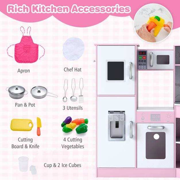 Comes with rich kitchen accessories, such as 1 chef hat, 1 apron, 1 pan and pot, 1 cutting board and knife, 1 cup and 2 ice cubes, 3 utensils and 4 chopped vegetables