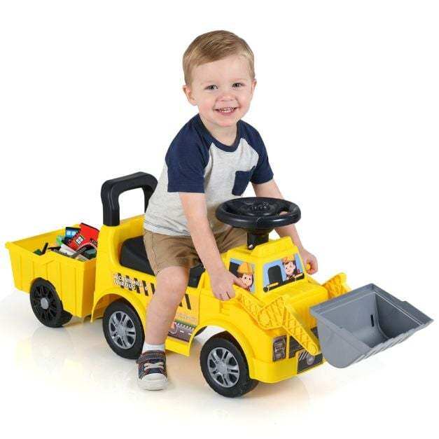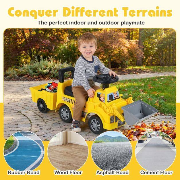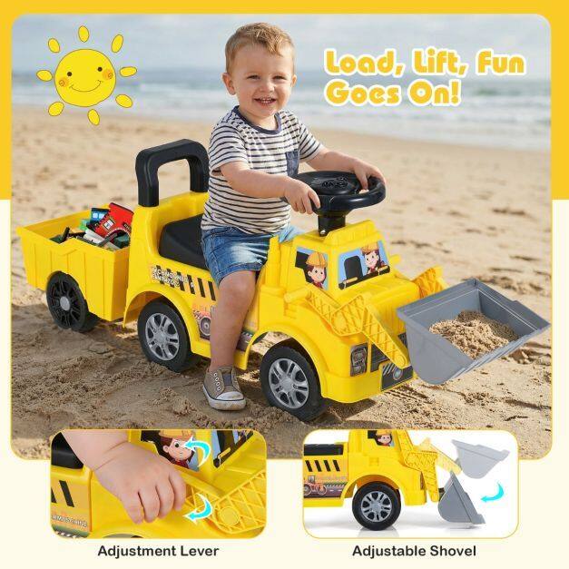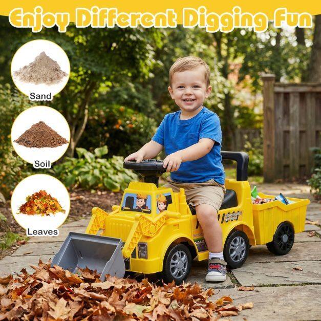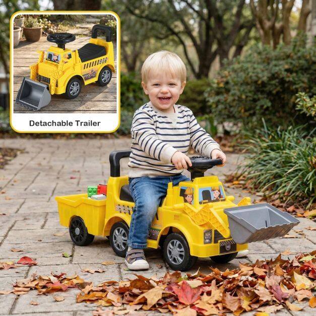 ● Optimal Digging Fun: The ride on excavator features an adjustable shovel, allowing child to easily dig sand, collect leaves, or scoop soil. The removable trailer adds extra excitement, letting kids haul their treasures wherever they play.