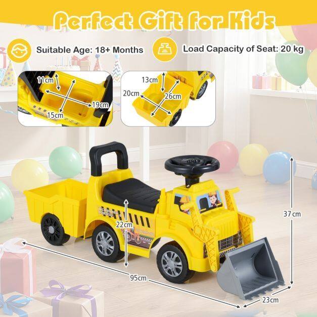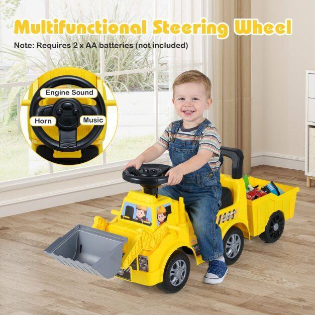 ● Interactive Steering Excitement: The multifunctional steering wheel brings playtime to life with engaging horn, realistic engine sound, and lively music. The kids digger ride on truck is perfectly designed for children aged 18+ months.