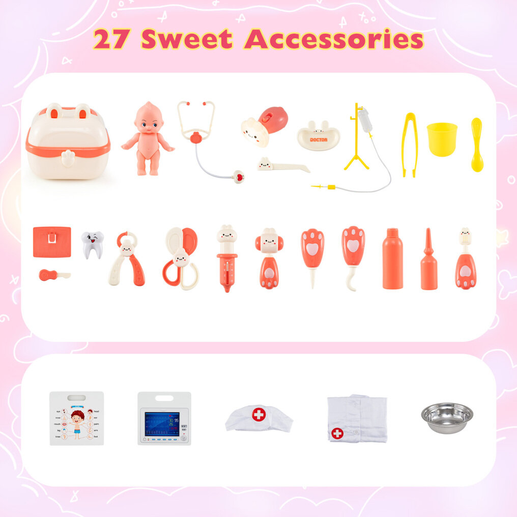 ● Endless Medical Adventures: Fuel your child's curiosity with 27 diverse medical tools designed for a variety of pretend play scenarios. The pretend doctor kit allows kids to simulate giving injections, perform tooth extractions, set up an infusion, listen to heartbeats with a stethoscope, and more.