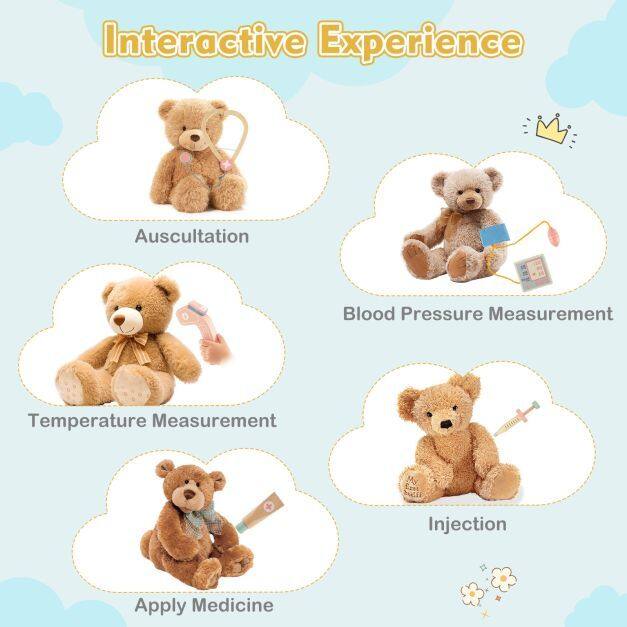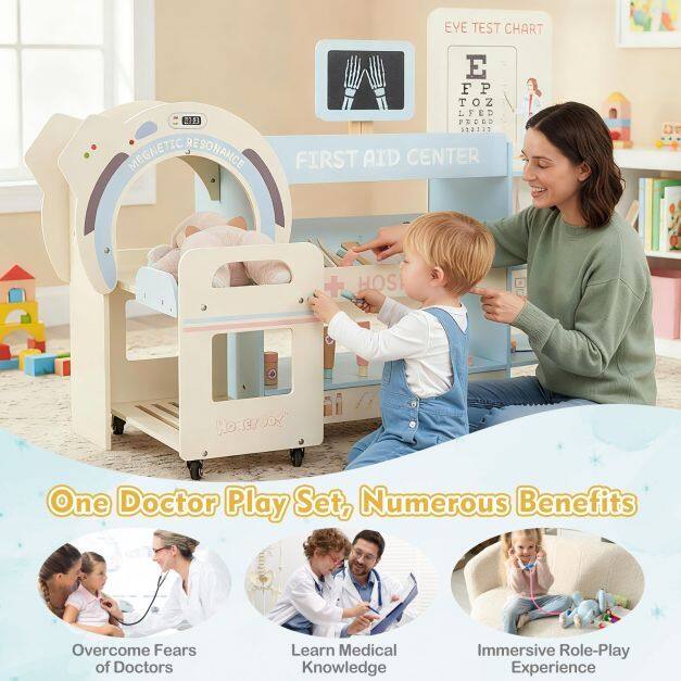 ● Multiple Interactive Play Areas: The kids doctor play set includes a toy CT machine, eye chart, and interchangeable films, inviting young doctors to dive into realistic medical scenarios. They can seamlessly transition from patient exams to detailed diagnostics, learning about healthcare in a fun and engaging way.