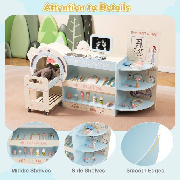 ● Ample Storage Space: The kids doctor playset comes with multiple storage shelves to keep playtime organized and tidy. Moreover, the included CT trolley doubles as a versatile storage cart with smooth universal wheels, enabling kids to move their hospital essentials from room to room with ease.