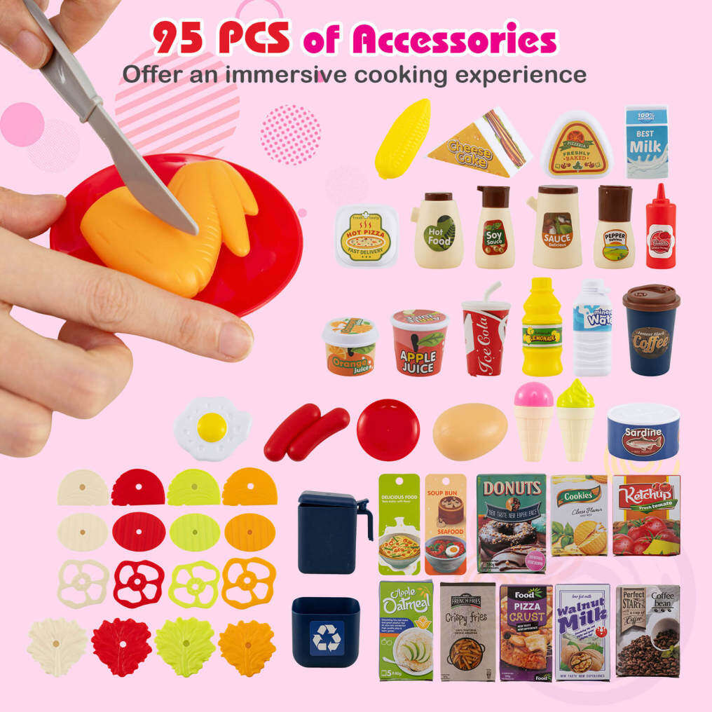 Sweet Kitchen Accessories: The pretend kitchen playset offers a rich array of accessories, including play food, snack boxes, bottles and cooking utensils. These elements complement the culinary playing experience, making it more enjoyable and realistic for little ones.