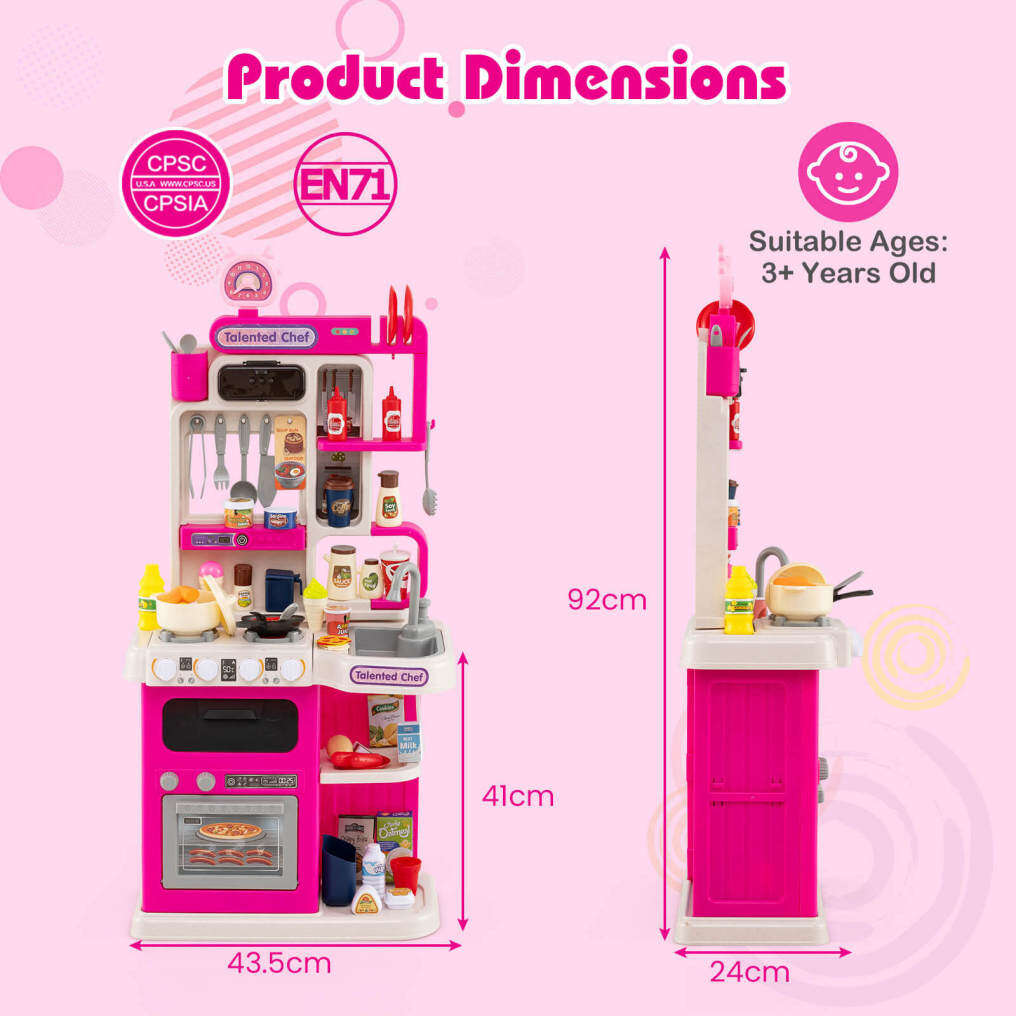The kids kitchen playset includes a microwave, refrigerator, and oven, complete with a functioning clock and an array of storage options such as dish racks, cutlery holders, and hanging hooks for a tidy setup. Moreover, the magic truly comes alive with two stoves that not only light up but also emit sound and steam, mimicking real cooking experiences. With a water circulation function, little chefs can wash dishes in the sink. To enhance the experience, the chef pretend playset packed with a variety of kitchen accessories that pave the way for endless creative play. Perfect for children above 3 years old, this kitchen play set serves as an exceptional gift that hones creativity, fine motor skills, and social interaction through imaginative play.
