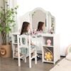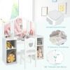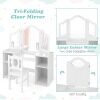 This vanity set includes a large tri-fold mirror and matching chair for a complete grooming experience. Four large storage shelves can hold your child's hair ties, nail polish, makeup or toys. And the wide tabletop allows your child to be creative in any imaginative way. In addition, the unbreakable acrylic mirror and rounded corners ensure the safety of your child. For the little angel in your family, this is definitely the best gift.