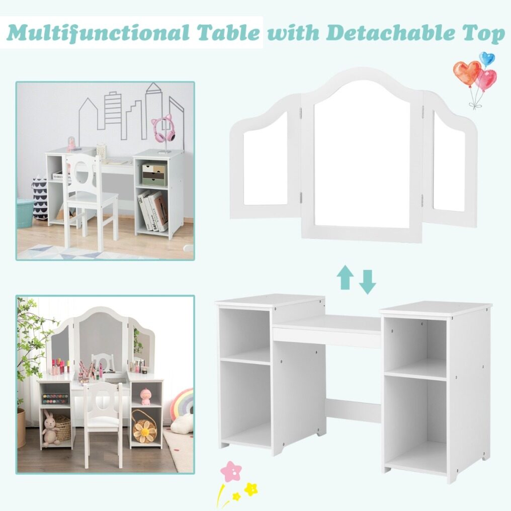 2 in 1 Design: The tri-fold mirror that comes with the table is removable. Therefore, in addition to being a dressing table for the little princess, it can also be turned into a playing table or a writing desk at any time. Whether in the living room, children's room or playroom, this multifunctional kids' table and stool set is a very practical piece of furniture.