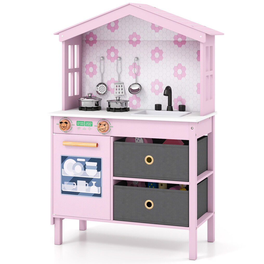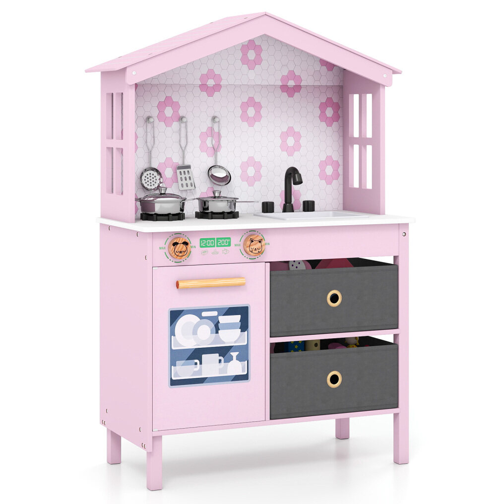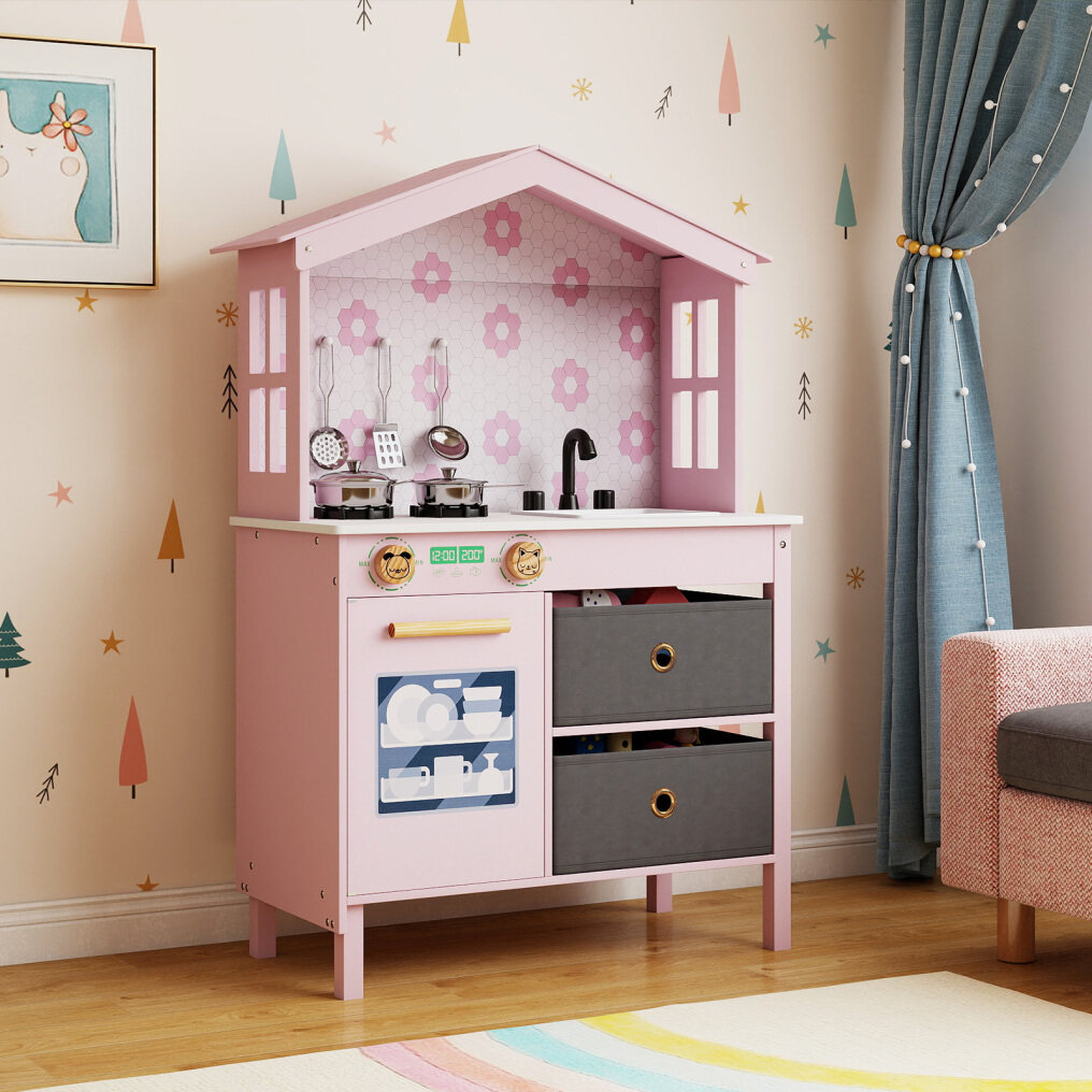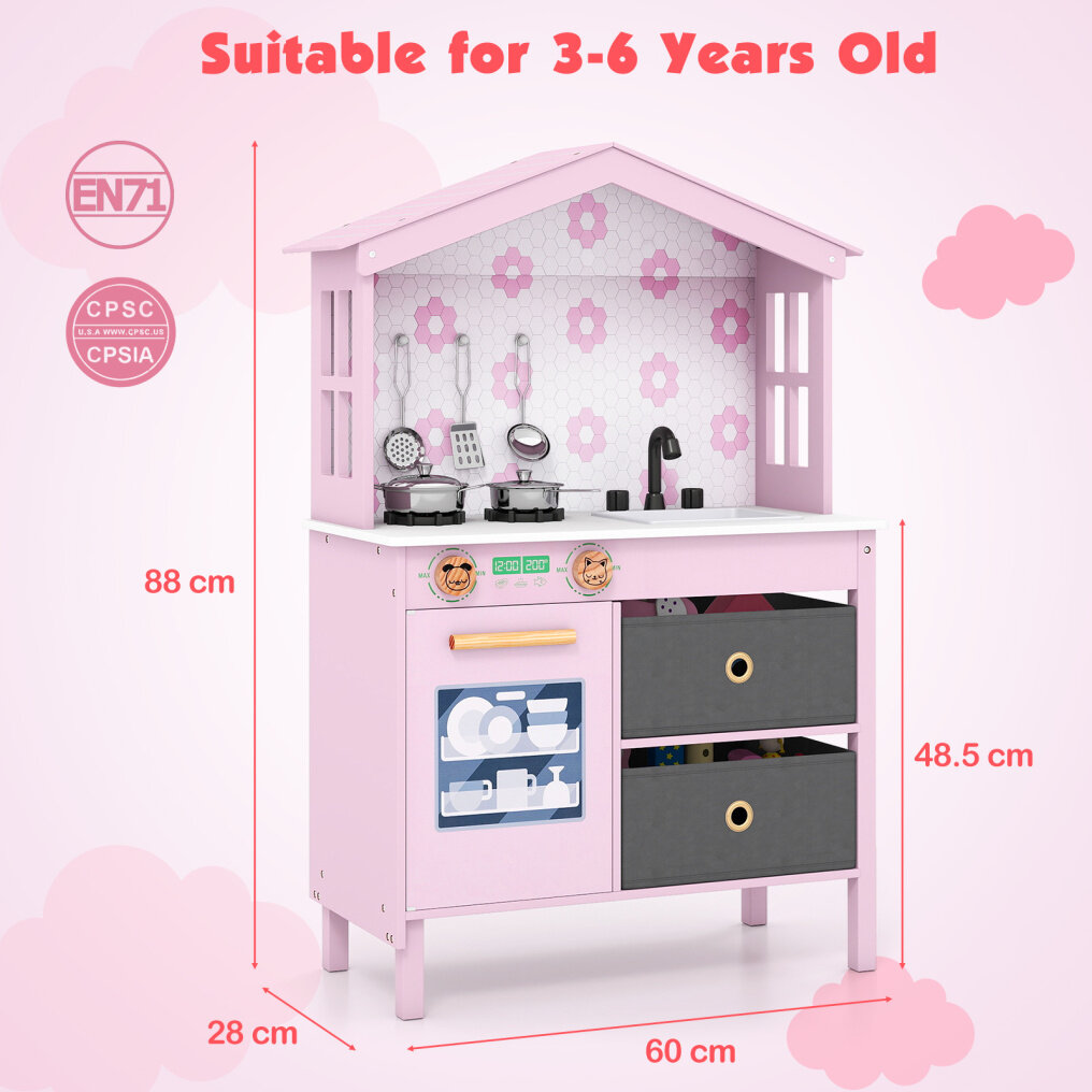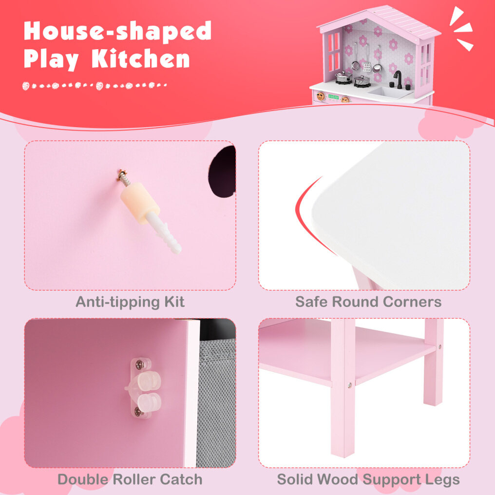 ● Adorable House Shape Inspires Creativity: The kids play kitchen's charming house design and lovely backdrop instantly spark endless imaginative adventures. Ideal for fostering creativity, sensory exploration, and social interaction, it invites children to cook, clean, and invent stories with friends and siblings.