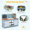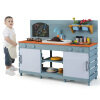 ● Imaginative Culinary Exploration: Featuring dual stoves and a grill rack, the play kitchen encourages children to explore their creativity and culinary skills. The rotating knobs make a clicking sound to enhance play experience while the chalkboard offers young chefs a space to jot down daily specials or display their menu.