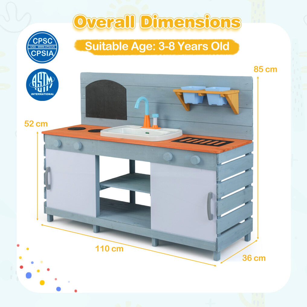 ● Sturdy Wooden Construction: Crafted from sturdy fir wood and stable support legs, this outdoor mud kitchen maintains a solid foundation to prevent tipping during play. Additionally, the rounded edges and splinter-free surface ensure a safe play space.