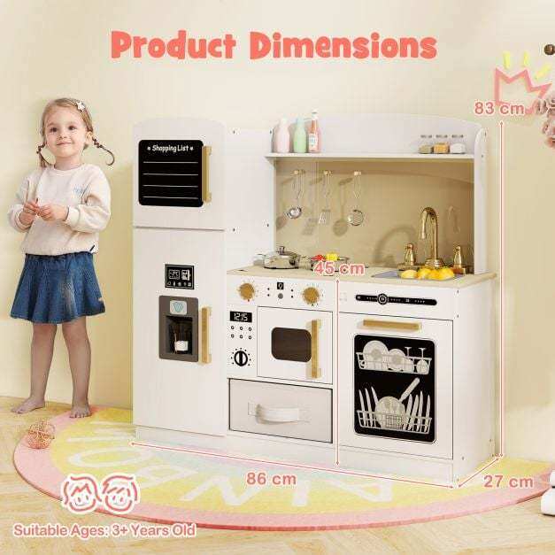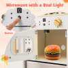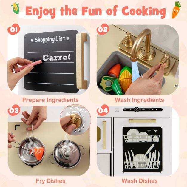 Culinary Adventure Corner: This play kitchen offers realistic elements like a sink with a faucet for washing vegetables and knob-turning features to ignite the stoves, fostering an immersive kitchen environment where your child can cook like a real chef. Little chefs can also enjoy more interactive fun with a light-up microwave, functional ice maker and dishwasher.
