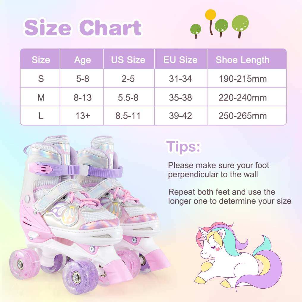 • 4 Sizes for Growing Feet: Featuring a simple one-button adjustment system, these roller skates for kids ages 8-13 years old seamlessly expand across 4 sizes, effortlessly accommodating your child’s foot as they grow. From child to teens, these skates ensure a secure fit so every stage is packed with hours of skating fun.