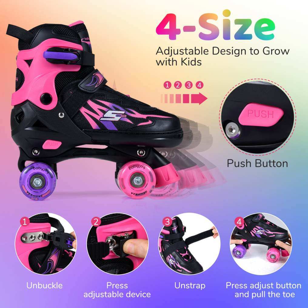 ● Adjustable Sizing for Growing Kids: Engineered to grow with your child, these skates feature a convenient one-button adjustment system. With a simple press, they smoothly expand across 4 sizes, ensuring a consistently secure and comfortable fit for kids ages 7-9.