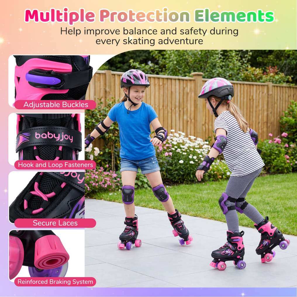 ● Enhanced Safety Design: Designed with multiple protection elements, these kids roller skates include sturdy buckles, hook and loop fasteners, and classic laces for a customized fit. Moreover, the reinforced braking system helps improve balance and safety during every skating adventure.