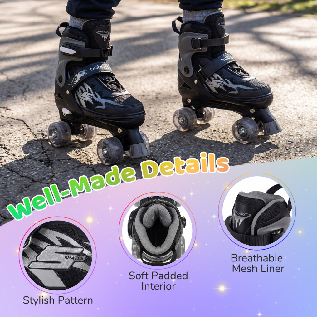 ● Battery-Free Light-Up Wheels: Equipped with motion-activated glowing wheels, these light-up roller skates illuminate with no batteries required. In addition, the vibrant lights add excitement to every ride, whether on neighborhood sidewalks or at the rink, making each outing more enjoyable.