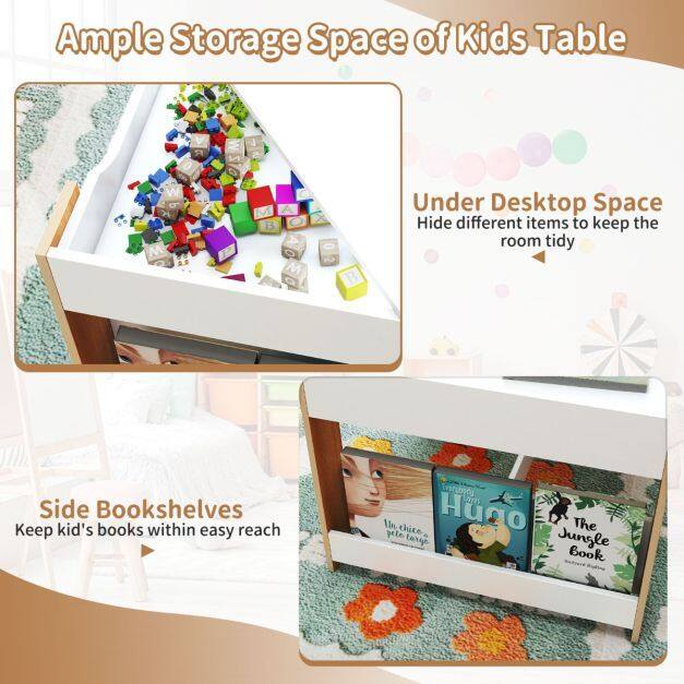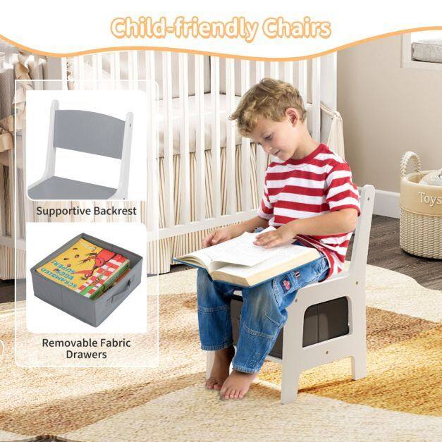 Ample Storage Space of Kids: Under desktop space can hide different items to keep the room tidy. Side bookshelves keep kid's books within easy reach, helping them develop a good habit of reading. Plus, removable fabric drawers of chairs provide more storage space for books, toys, and art supplies.