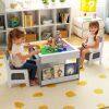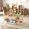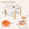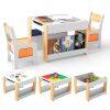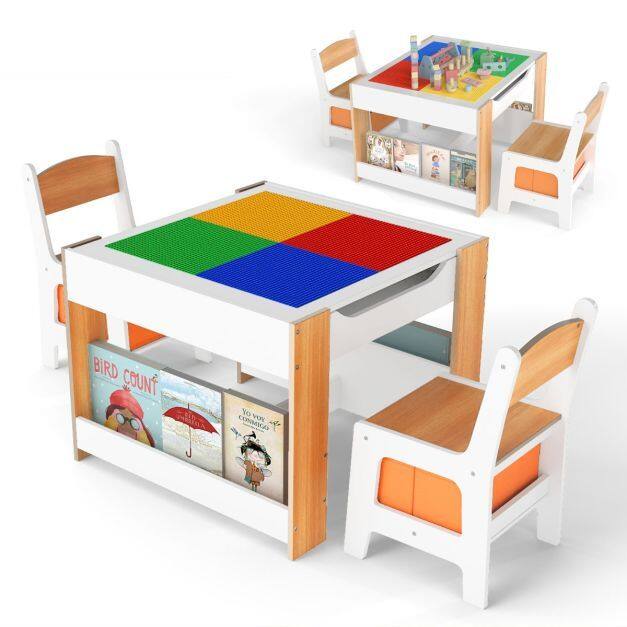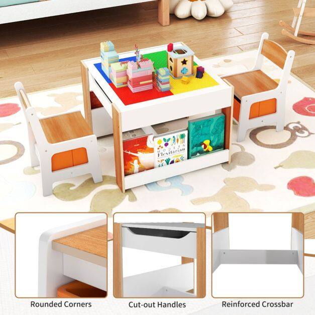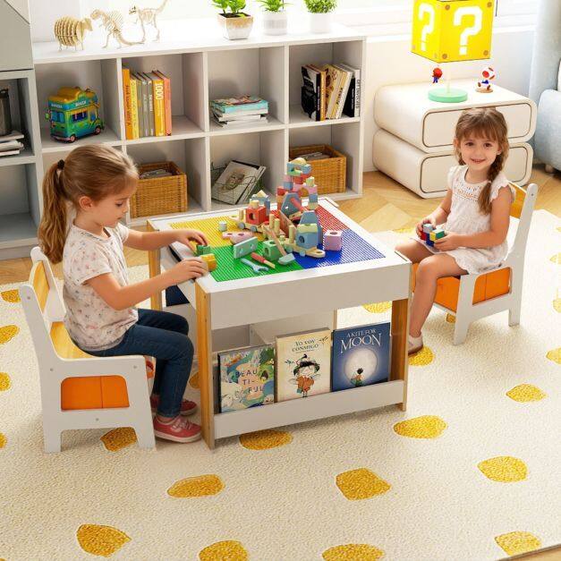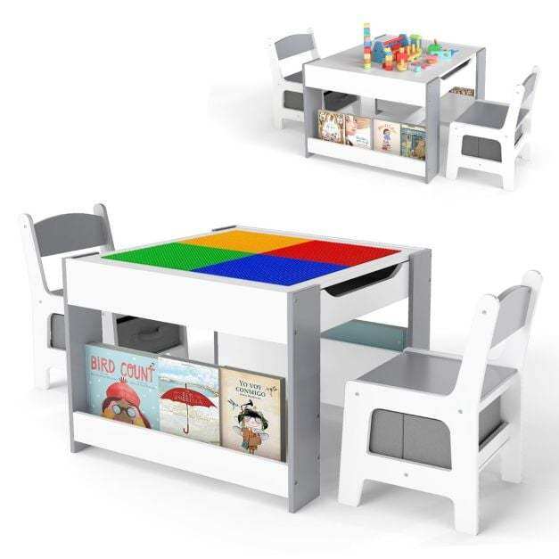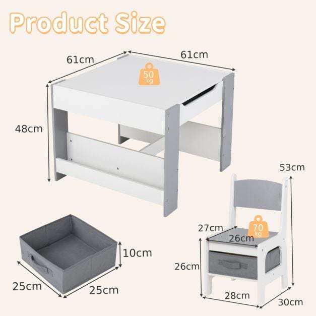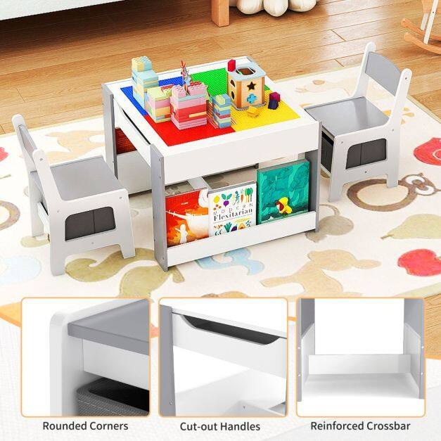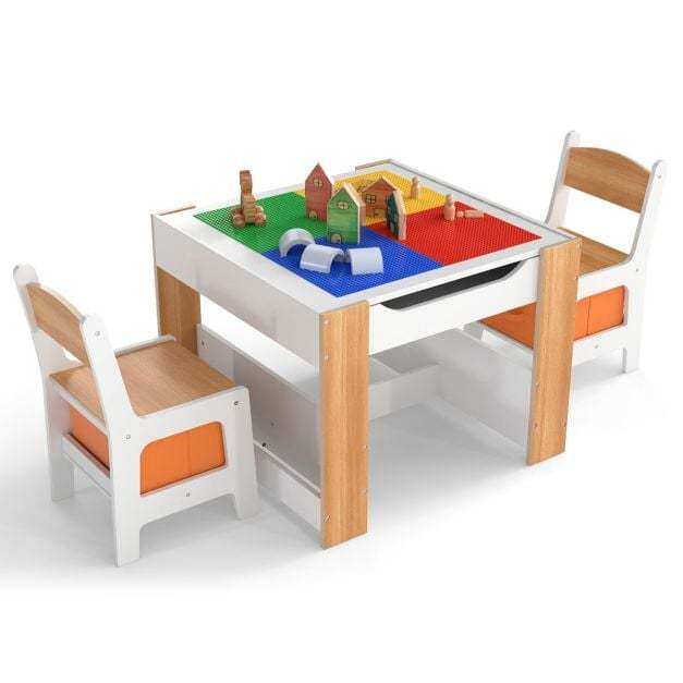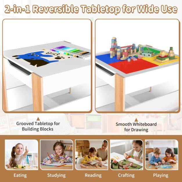 2-in-1 Reversible Tabletop: The kid’s table is designed with a removable and reversible tabletop. One side of the tabletop is a smooth whiteboard for drawing, while the other side is a grooved tabletop for building blocks, meeting kid’s different needs.