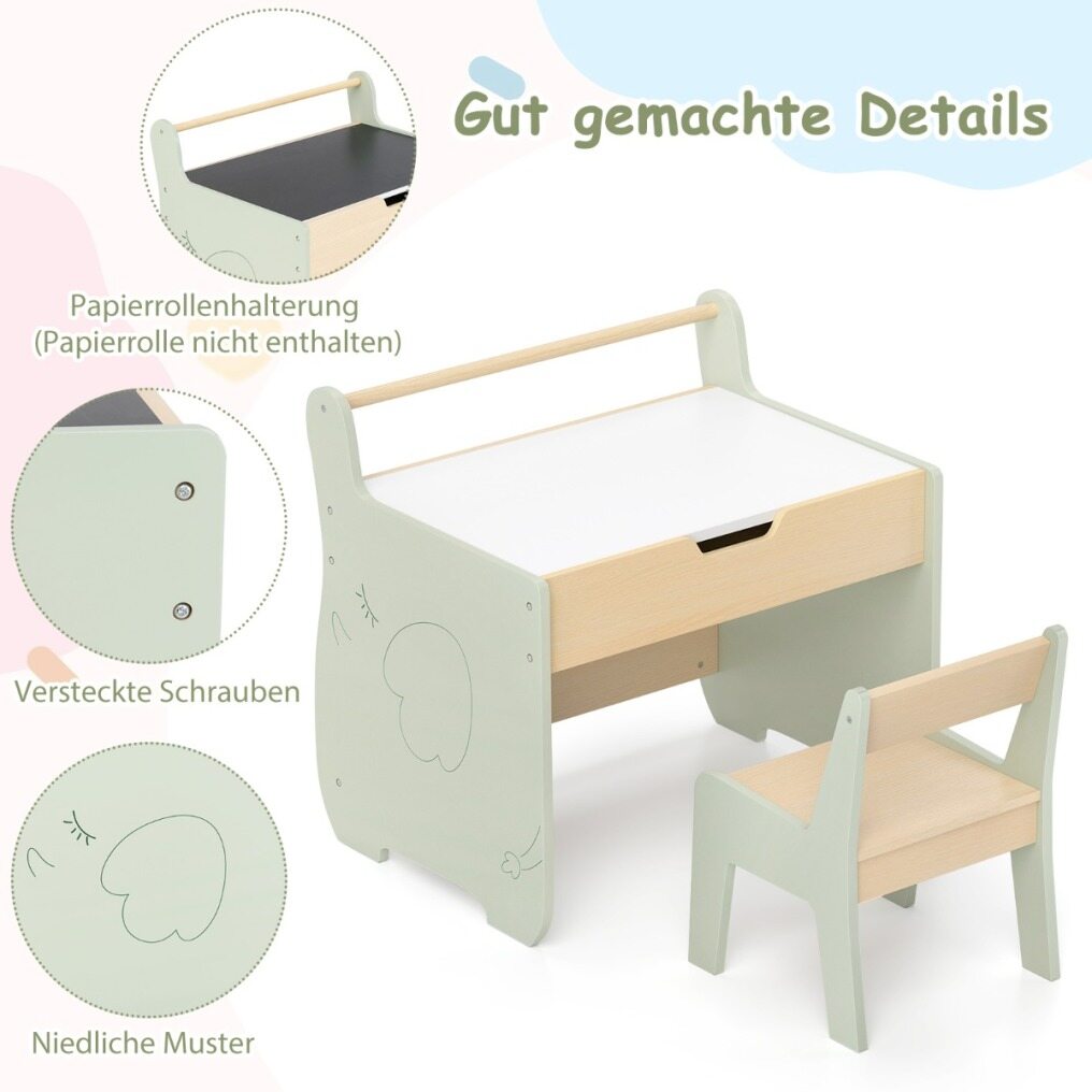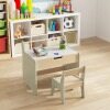 The detachable tabletop switches between a whiteboard and chalkboard, inspiring various activities. Built-in storage space keeps tools and toys neatly arranged for a focused learning environment. The integrated paper roll holder allows continuous art projects. Safety is prioritized with rounded edges and sturdy structure. This desk and table set will be a great addition to your little one’s room.