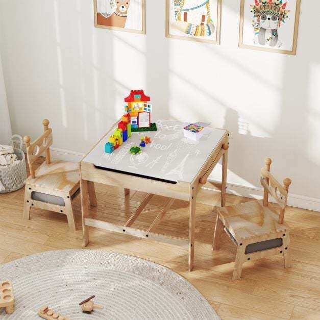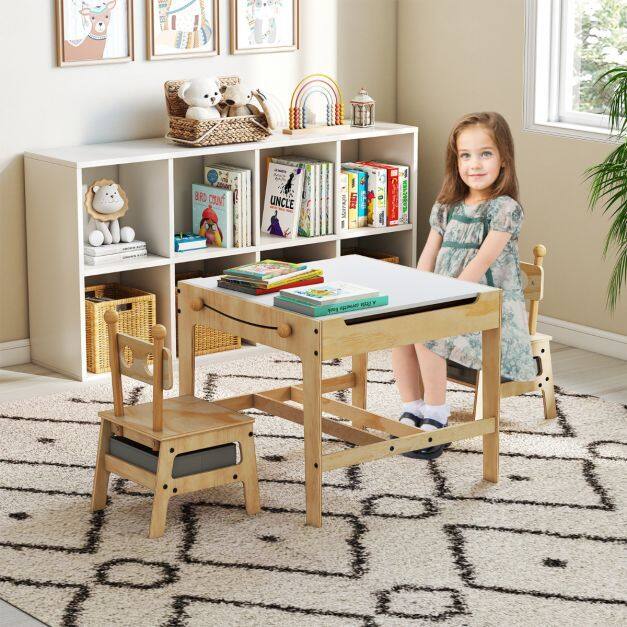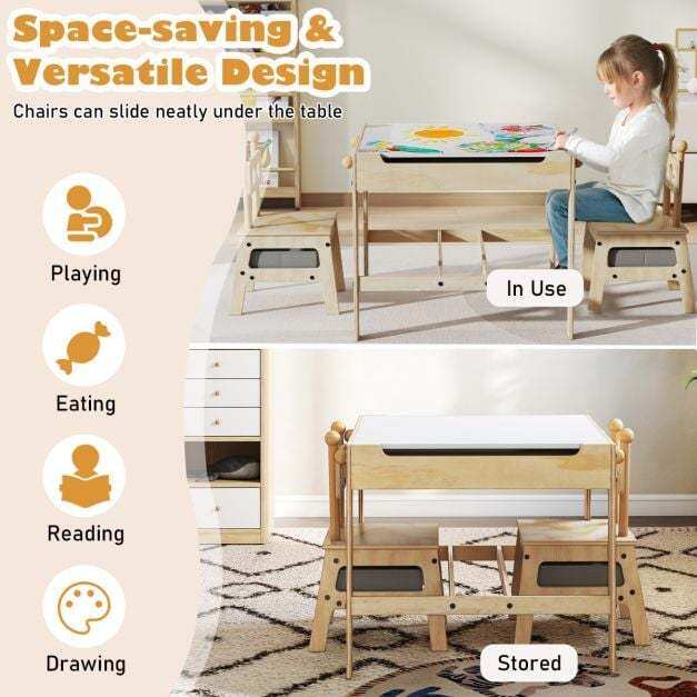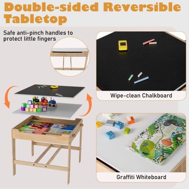 ● 4 in 1 Versatile Activity Table: Featuring a reversible whiteboard (recommended to use chalks to draw on it) and chalkboard, this kids table and chairs set is ideal for arts, crafts, reading, writing, drawing, playing and eating. The thoughtful flip-up groove allows you to easily flap the tabletop or remove it.