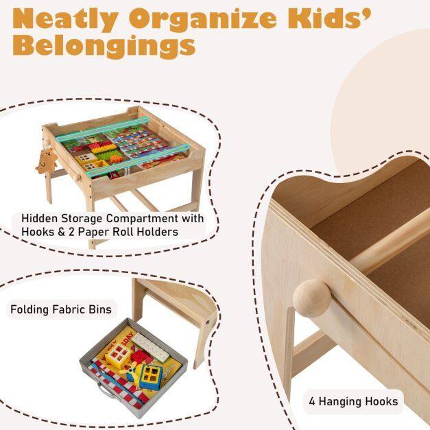 ● Specifically Designed for Kids: Thoughtfully built with children in mind, each chair in this set is designed with a cute pandat-shaped backrest. Plus, 2 solid wood sticks inside the table serve as paper roll holders and hooks, not only supporting creativity but also keeping necessary items within easy reach.