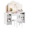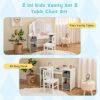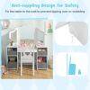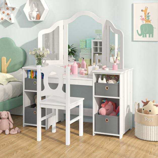 This multi-use kids table and chair set caters to activities like dressing up, reading, and drawing. Featuring ample storage with open compartments and removable bins, it keeps your child's essentials organized. The shatterproof tri-folding mirror offers safety and functionality, enhancing their grooming and play experiences. Safety is prioritized with an anti-toppling device and rounded corners for worry-free fun.