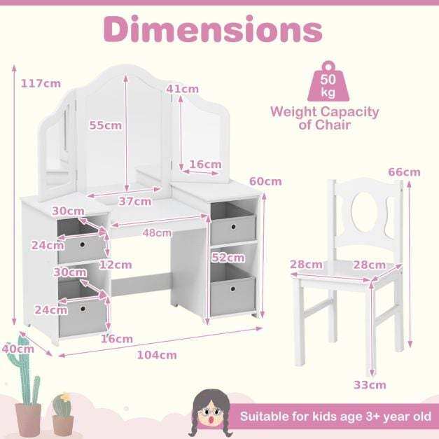 Tri-Folding Mirror: Made from shatterproof acrylic, this tri-folding mirror ensures the safety for children. It also provides a full view for grooming or dress-up experiences, enhancing the overall charm and functionality of the toddler vanity set.