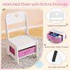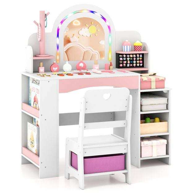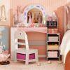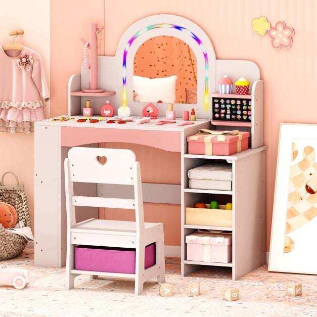 Kids Vanity Set with Colorful LED Lights Princess Makeup Dressing Table with Chair-White