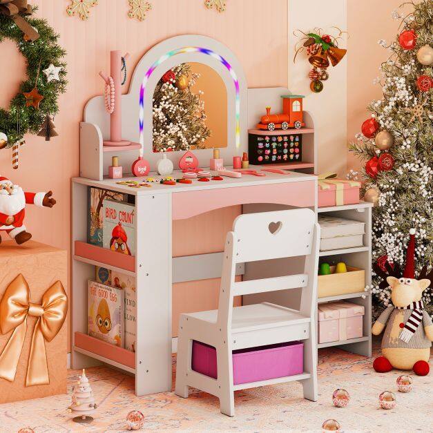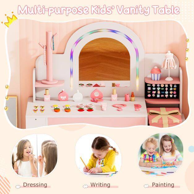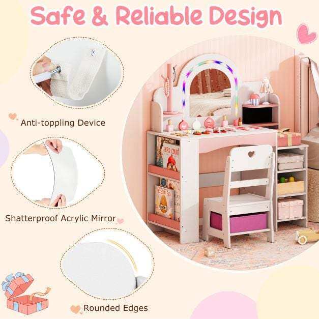 • Magical LED Mirror: This princess vanity set features a large mirror framed by colorful LED lights. The soft, whimsical glow brings a magical touch to any kids’ space, making it perfect for pretend play and imaginative sessions. Plus, 3 fun accessories are also included.