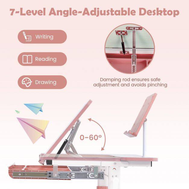 ● Angle-Adjustable Desktop: The 7-level adjustable desktop can be adjusted within the range of 0-60°, fulfilling kids' needs of writing, reading or drawing. In addition, damping rod ensures safe adjustment and avoids pinching, which perfectly protects kids' safety.