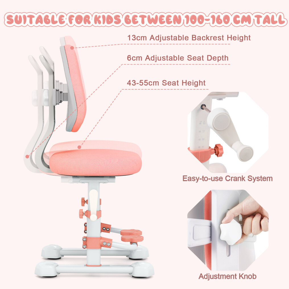 Seat Height & Depth Adjustment: The desk chair offers adjustable seat depth, tailoring the height to your child's needs as they grow. It also features stepless seat height adjustment from 43-55 cm via an easy-to-use crank system, making it suitable for children between 100-160 cm tall.