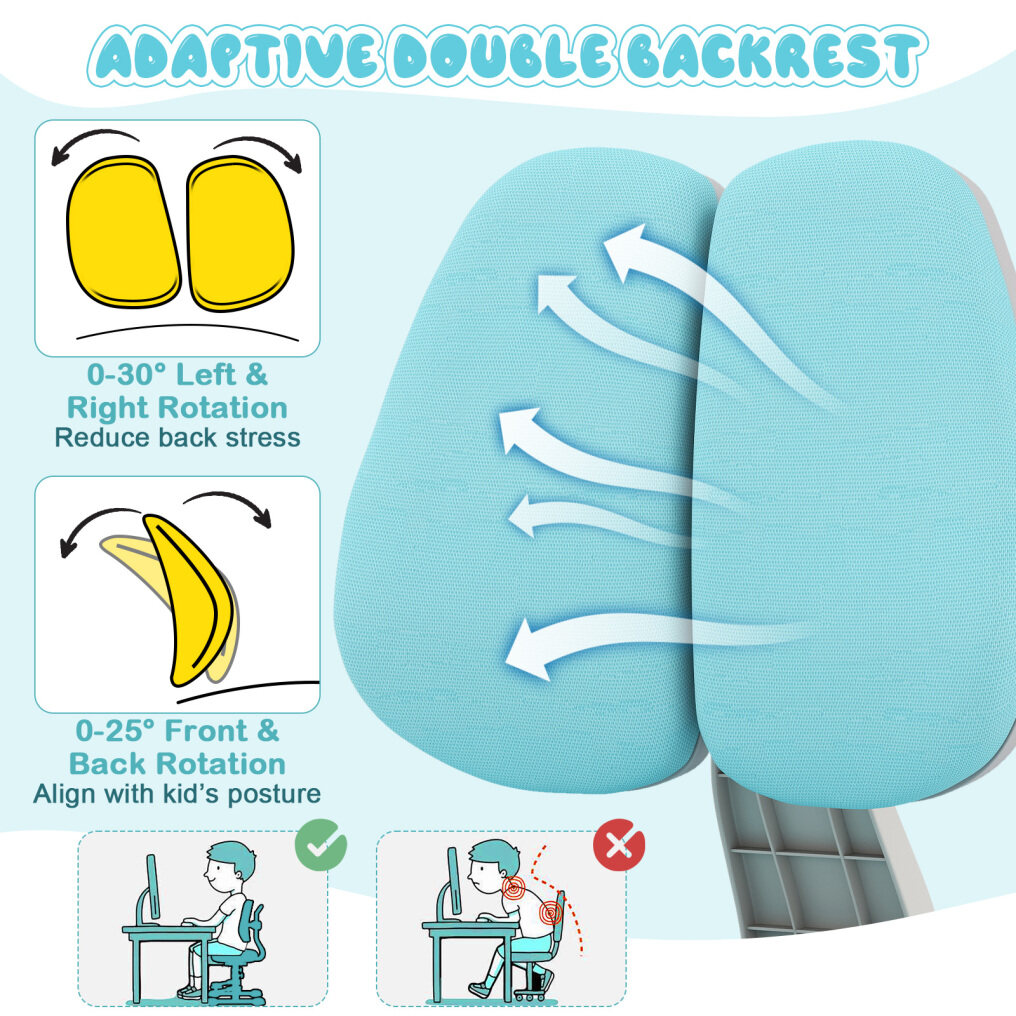 Ergonomic Backrest: Our toddler chair features an adaptive double backrest with 0-30° left and right rotation to reduce back stress and 0-25° front and back tilt to automatically align with your child's natural posture.
