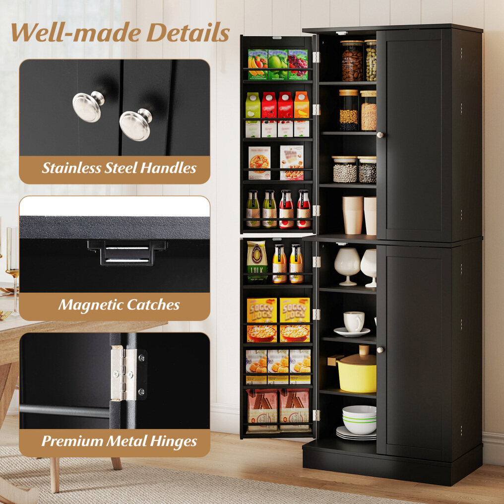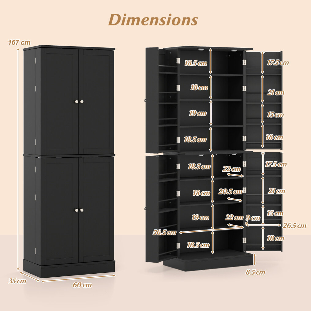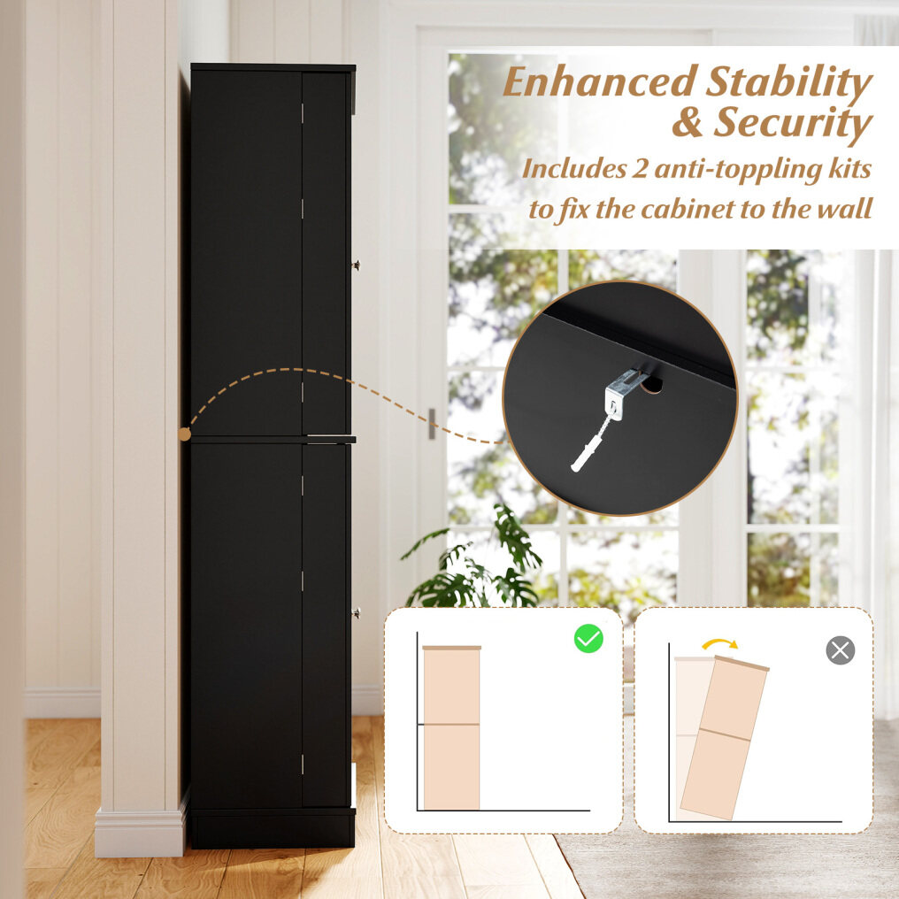 ● Enhanced Stability & Security: Crafted from high-quality boards and premium metal hinges, this 4-door pantry cabinet is built to last. The inclusion of 2 anti-toppling devices helps to secure the cabinet firmly in place for safe use.