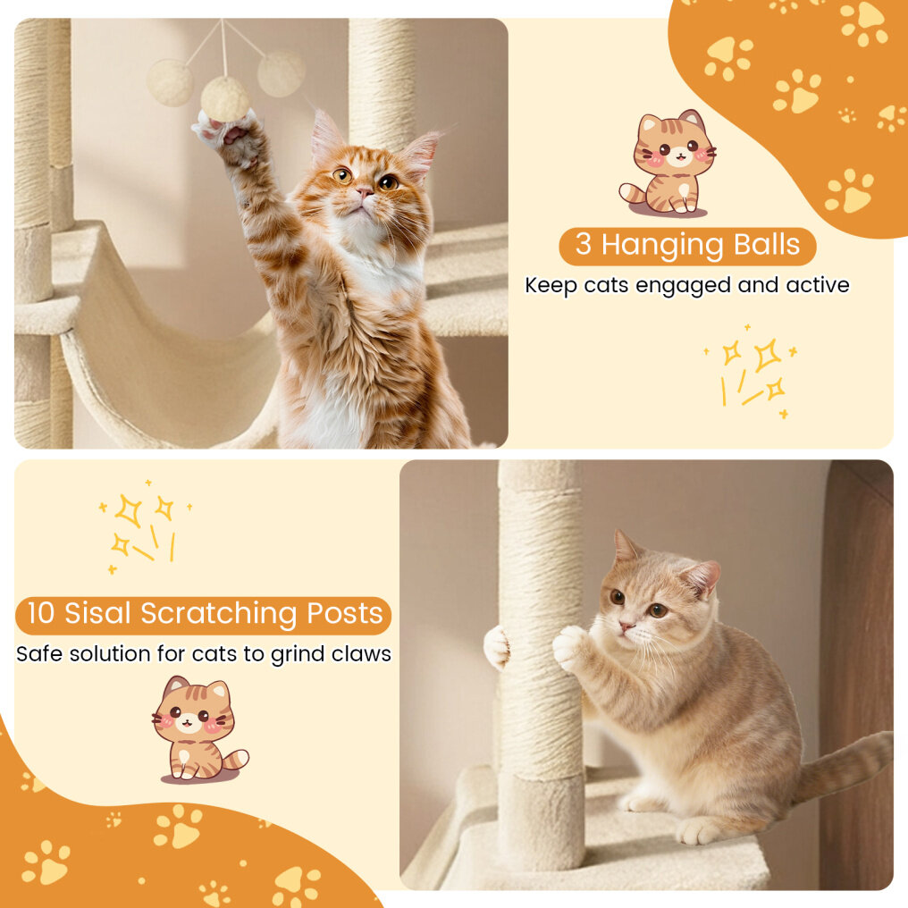 Interactive Playtime: Equipped with sisal-wrapped scratching posts, the multi-level cat tower offers a perfect outlet for healthy scratching habits, helping protect your furniture. Plus, 3 dangling balls stimulate your cat's playful nature, encouraging active engagement and exercise.