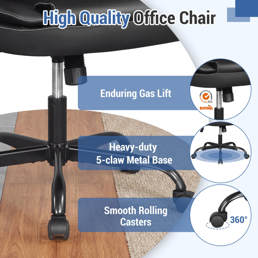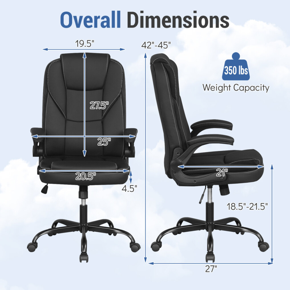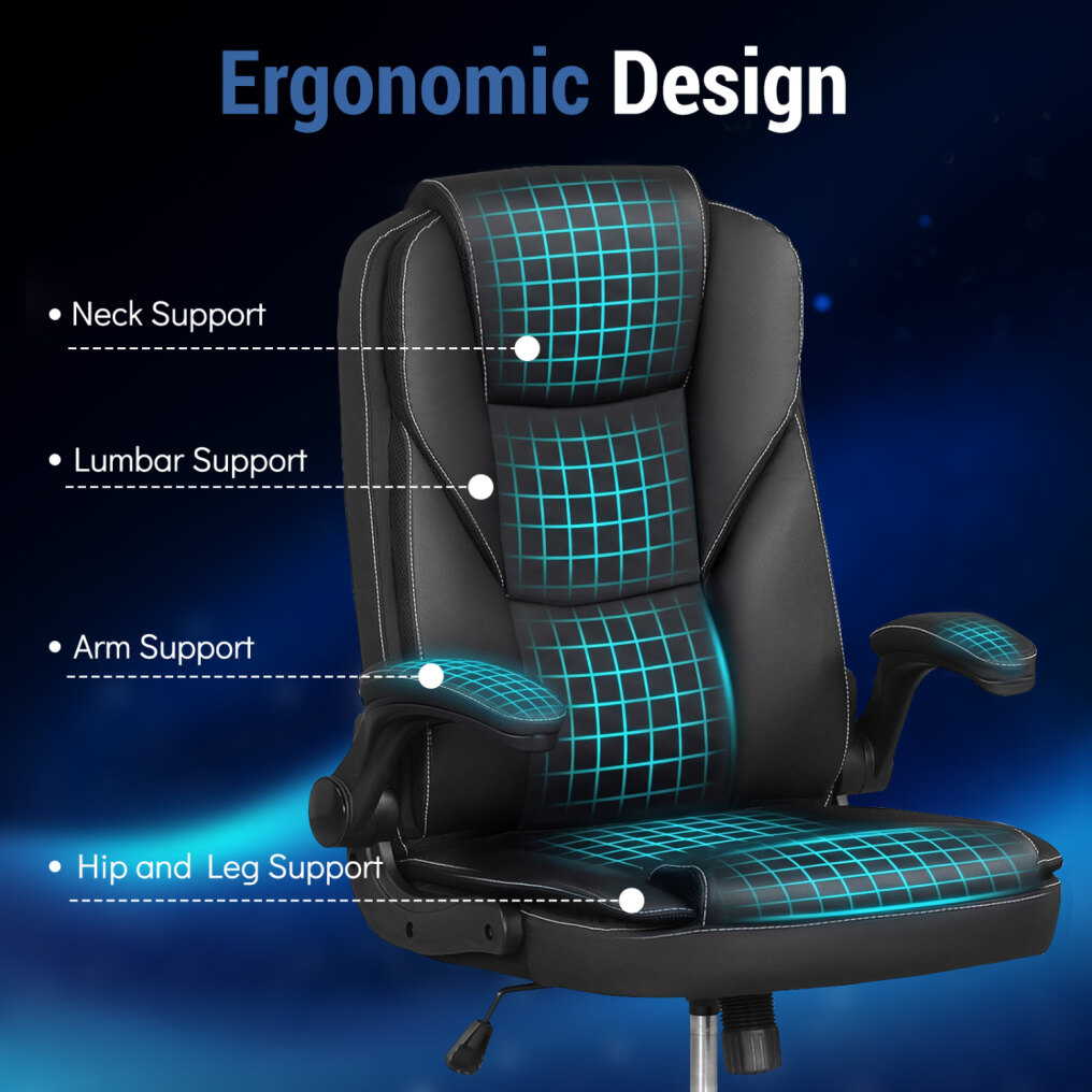 ● Leather Office Chair: Upholstered in premium PU leather, this executive chair ensures durability and lasting coziness, making it ideal for long hours of focused work. Plus, the high-density sponge padding boasts a perfect balance of softness and support.