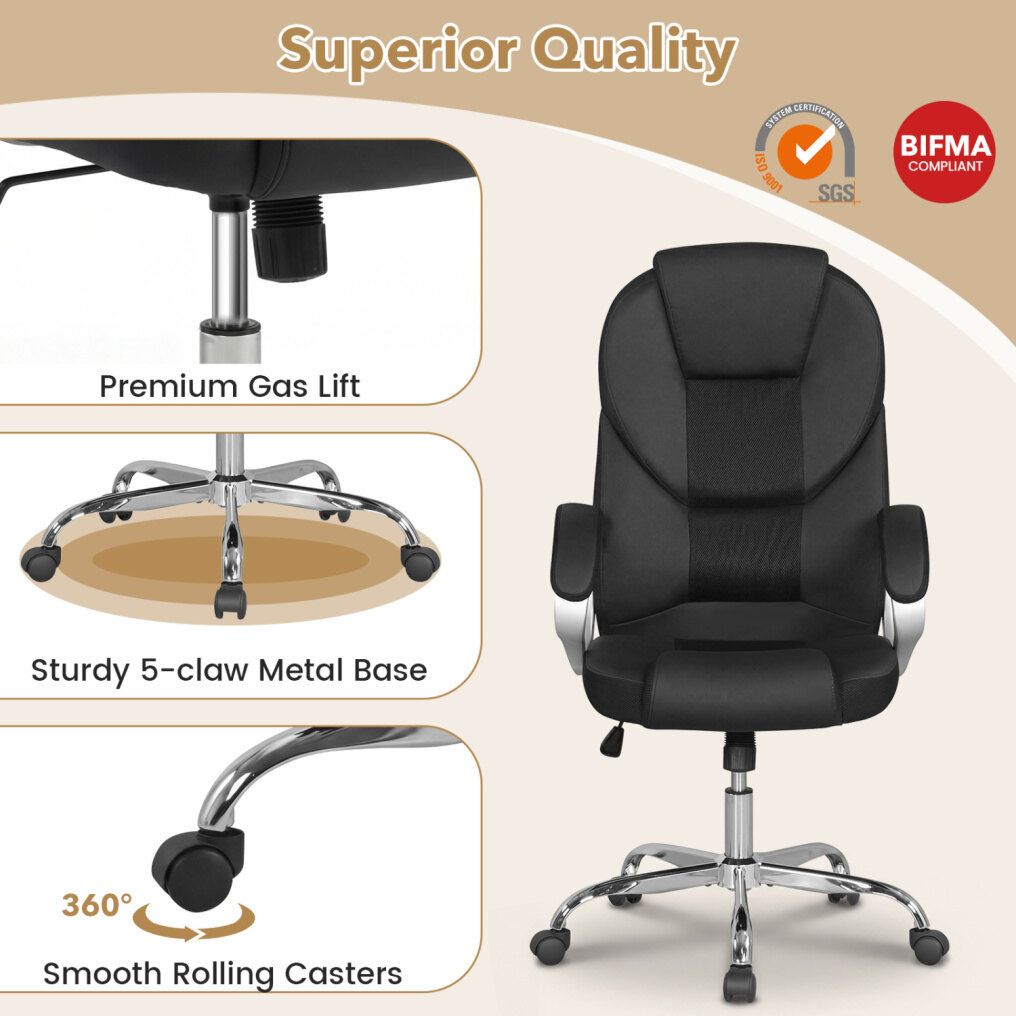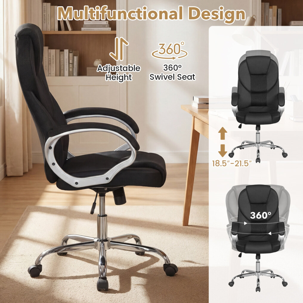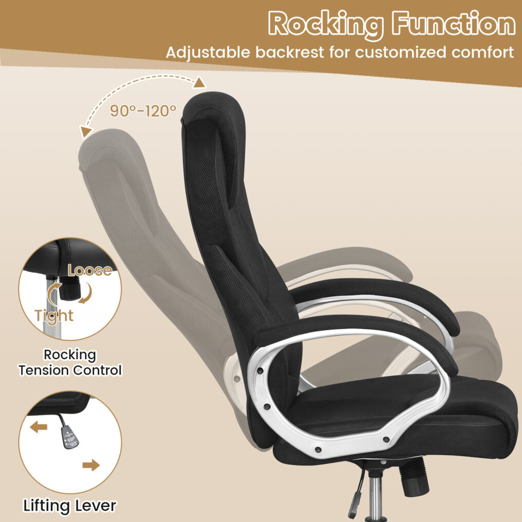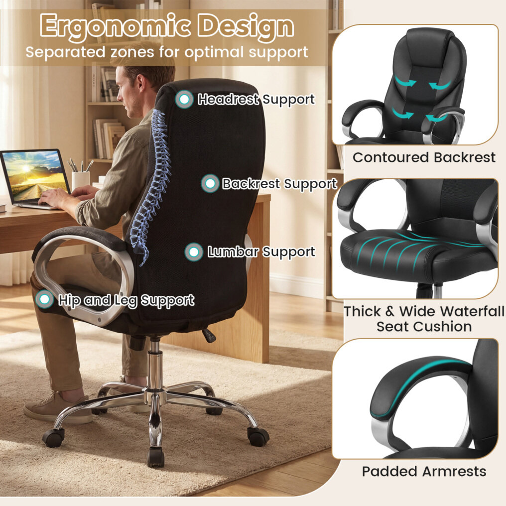 ● Ergonomic Design: This executive chair features rocking function that lets you gently sway back for a relaxing break or sit upright for focused work. Additionally, the contoured backrest and padded armrests enhance overall comfort throughout the day.