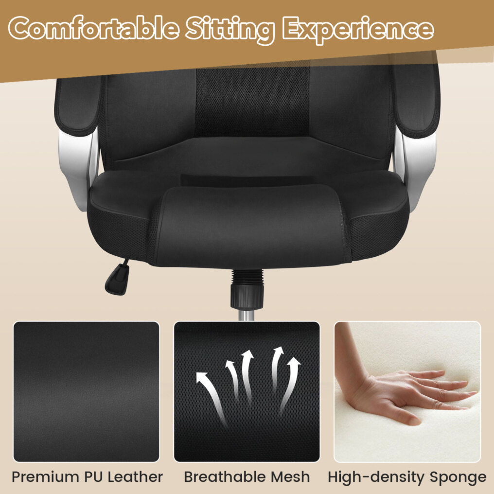 ● Comfortable & Breathable Seating: This office chair combines PU leather upholstery with breathable mesh, offering a perfect balance of support and ventilation for extended sitting sessions. The thickened sponge padded seat adds extra comfort.