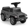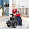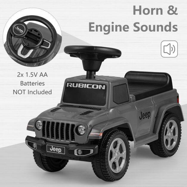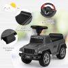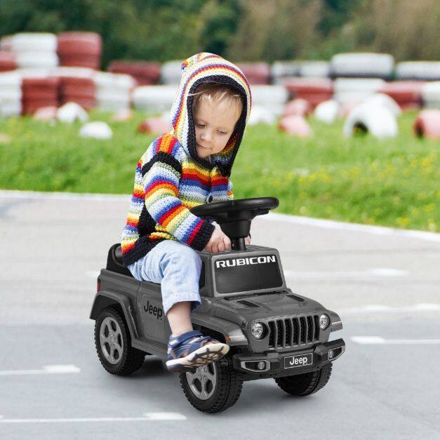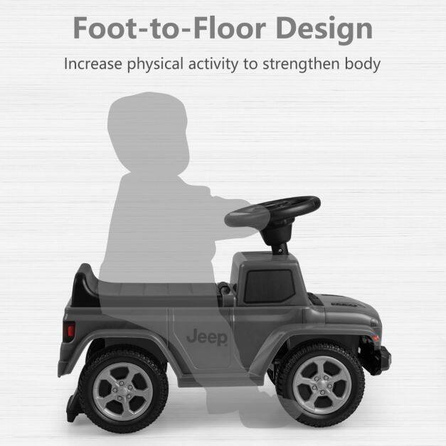 Impress your little one with this Jeep licensed ride on push car! With striking stylish appearance and luxury details, toddlers will be attracted by this push ride-on car. It features 2 ways to use, and kids can choose to slide the car by foot or push the car to move. And the reasonable seat height design enables kids to get on or off the car with ease. Fitted with anti-falling device, the toddler ride on car won't easily roll over. Moreover, the steering wheel is designed with 2 buttons for your little one to press, which makes the horn or engine sound for increased fun. And the "whisper ride" wheels also provide a smooth and quiet ride, allowing your child to easily cruise around the neighborhood. Even better, there is a spacious storage compartment under the seat, helping collect baby's books and toys to free parents' hands when going out.