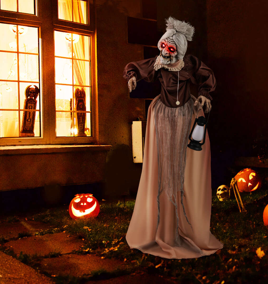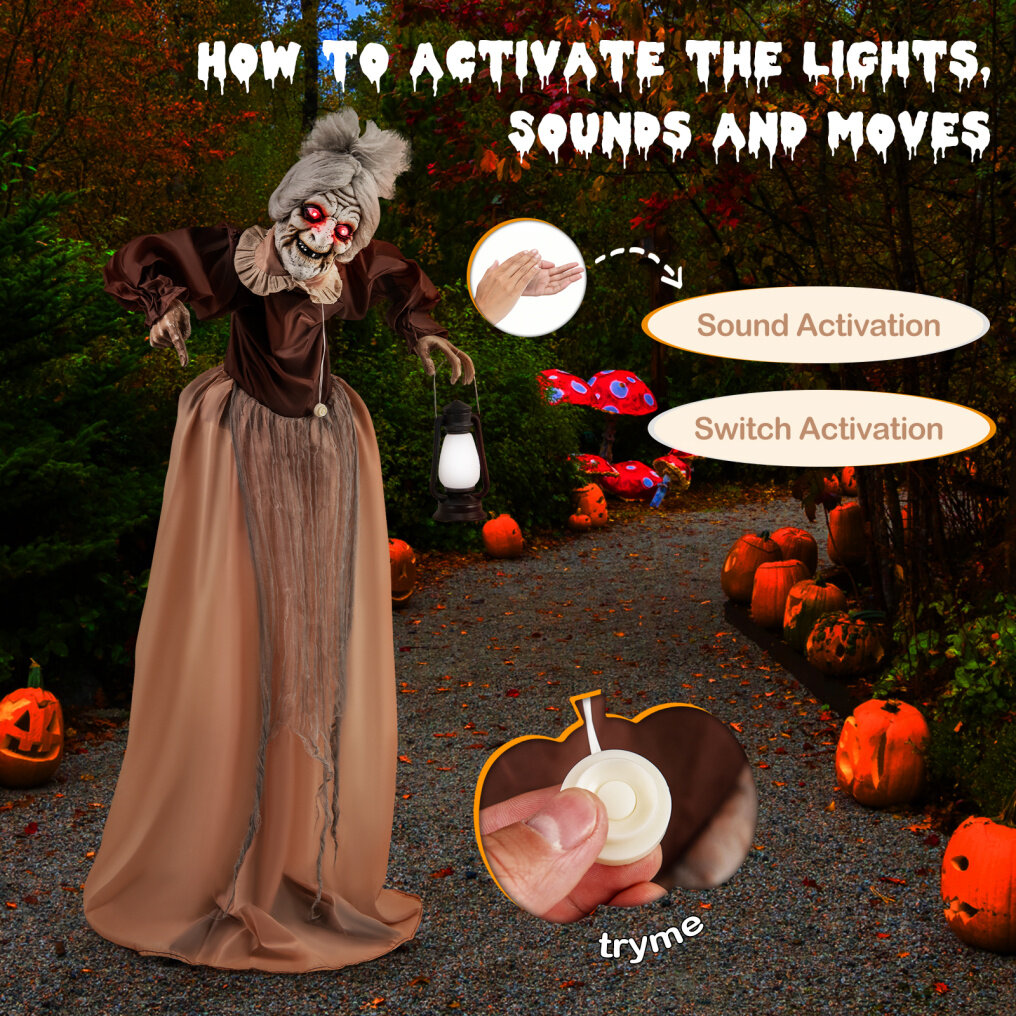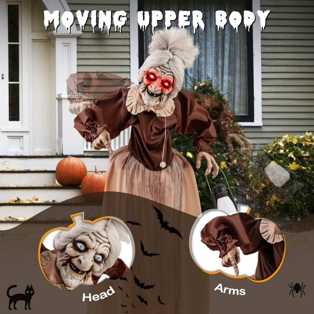 ● Realistic Halloween Appeal: Dressed in a life-like costume and carrying a lantern, this animatronic old lady adds a touch of authenticity. She makes a harrowing addition to your Halloween festivities, impressively enhancing both mood and theme.