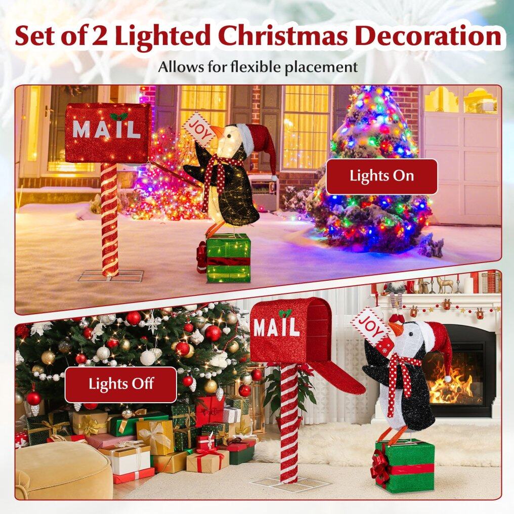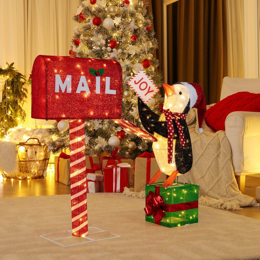 ●Charming Design for Holiday Joy: This festive decoration features a cute penguin holding a letter while standing on a gift box next to a Christmas mailbox, creating a heartwarming holiday scene that captures the magic of the season.