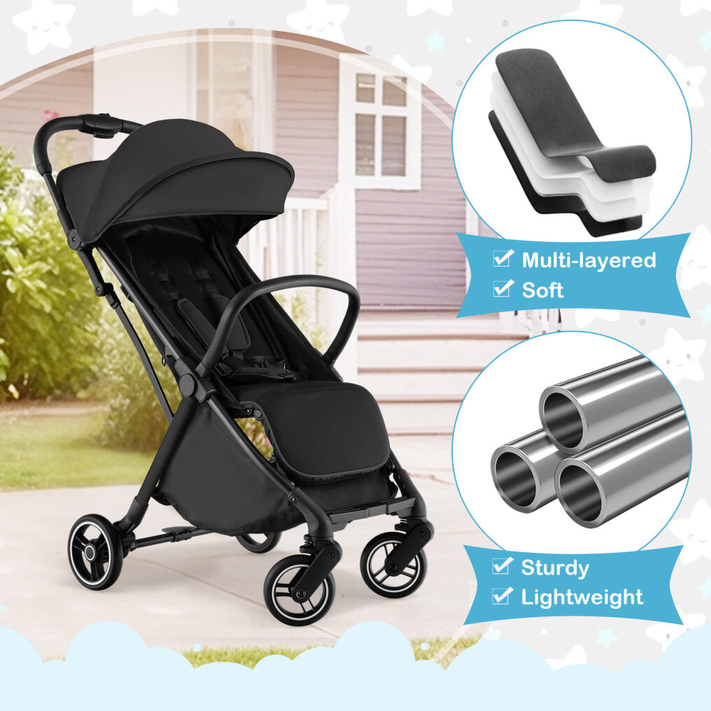 ● Compact One-Hand Fold: This compact stroller is designed for effortless travel. This lightweight stroller folds quickly with a single hand, making it easy to store in overhead compartments or tight spaces.