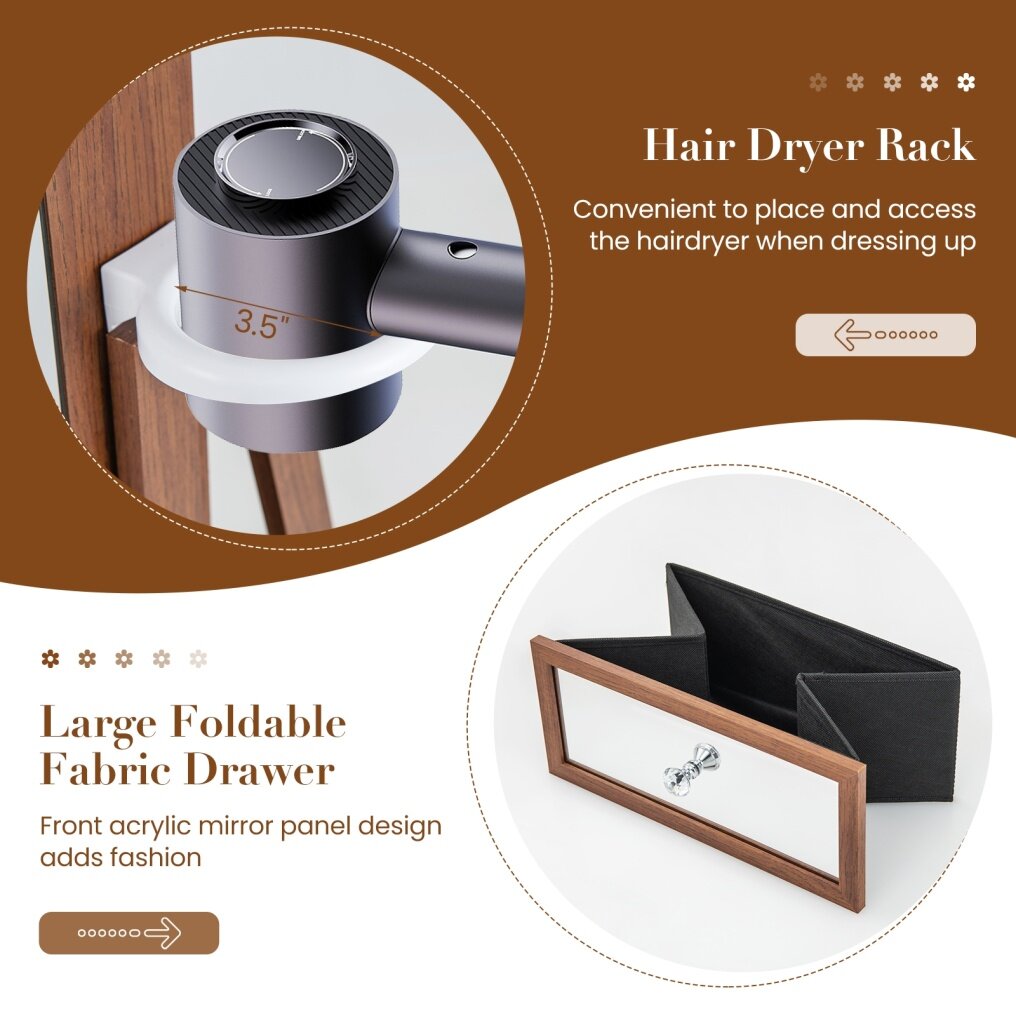 ● Upgraded Convenience and Chic Design: This mirrored jewelry cabinet comes with a hair dryer rack, making it convenient to place and access the hairdryer when dressing up. In addition, the large foldable fabric drawer at the bottom with a front acrylic mirror panel design adds fashion.