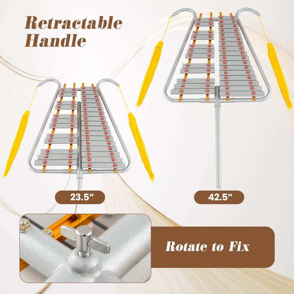 Discover the enchanting world of music with our 29-note marching glockenspiel xylophone! Crafted from high-quality aluminum, the marching xylophone offers melodious tones, better resonance, and high durability. The 29 marked keys help beginners identify and play the notes. Thanks to the retractable handle, the glockenspiel is adjustable in length, making it suitable for people of different heights. In addition, the glockenspiel attaches to your waist with the belt clip, allowing you to take your music with you wherever you go.