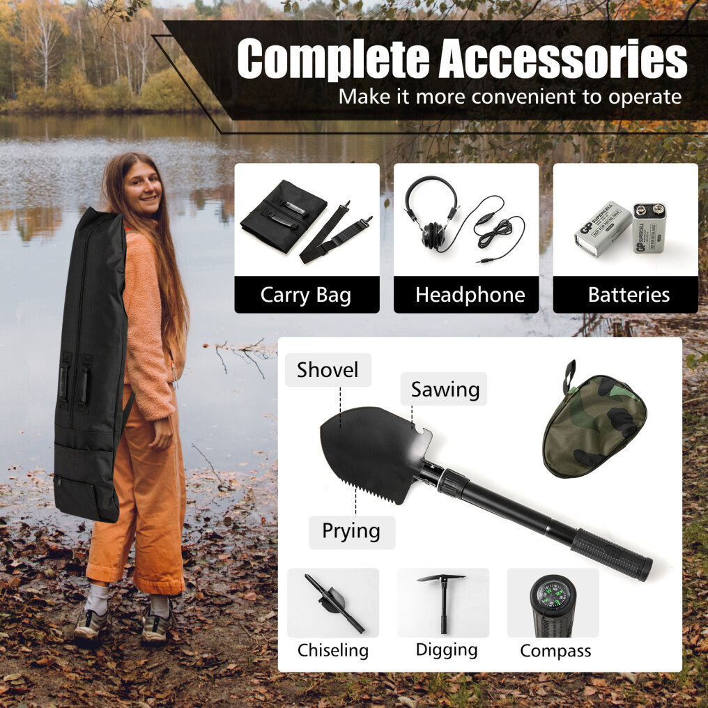 ● Essential Accessories Included: Coming with a carry bag, the metal detector and its accessories are easy to carry. The multifunctional shovel can be used for sawing, prying, digging, chiseling, or as a compass, equipped with a bag for convenient use. The headphone and batteries add convenience.