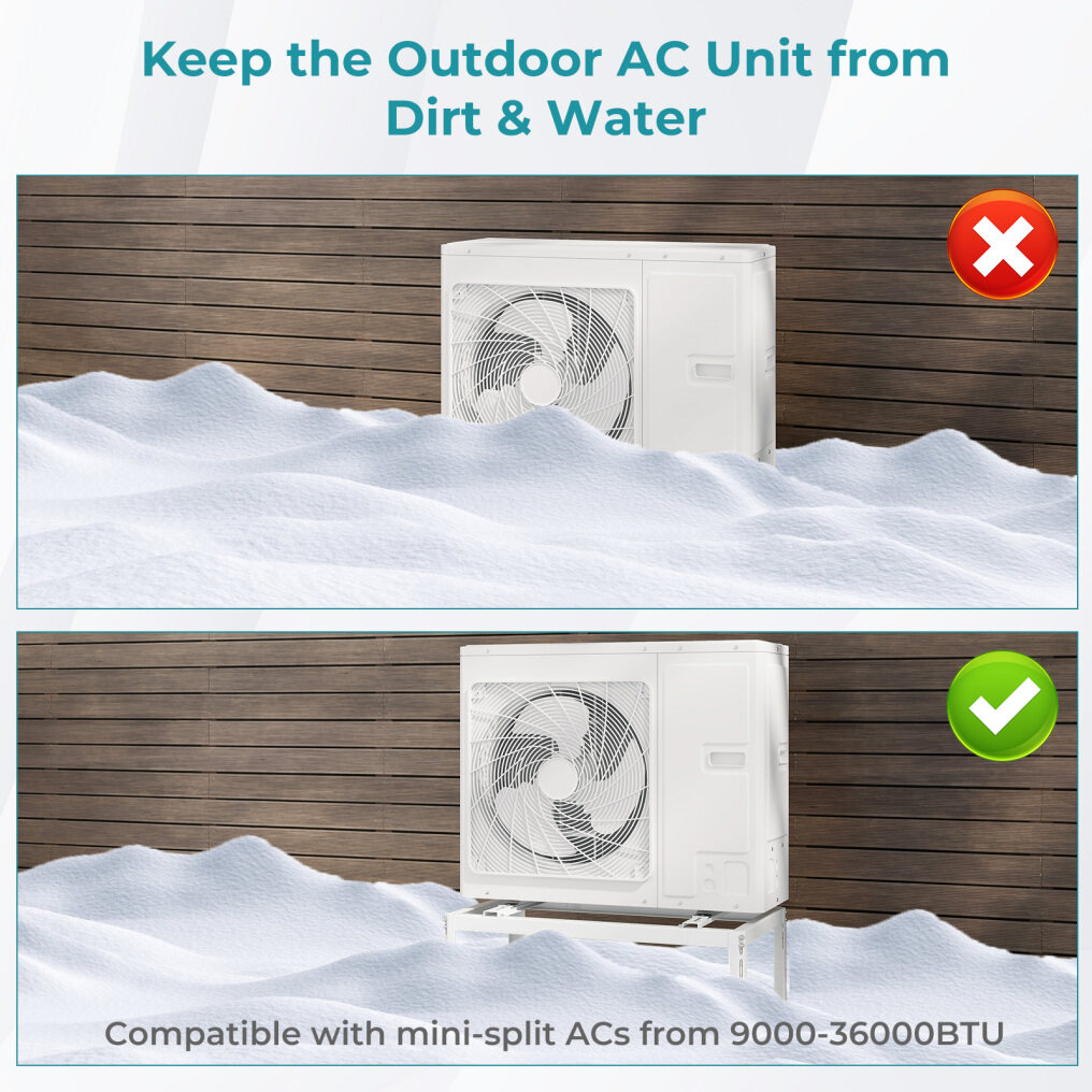 ● Maintenance-friendly Design: This heavy duty mini split bracket is designed to keep your outdoor air condenser off the ground. The elevation helps reduce the accumulation of dirt, leaves or snow, making it easier to clean while improving system efficiency.