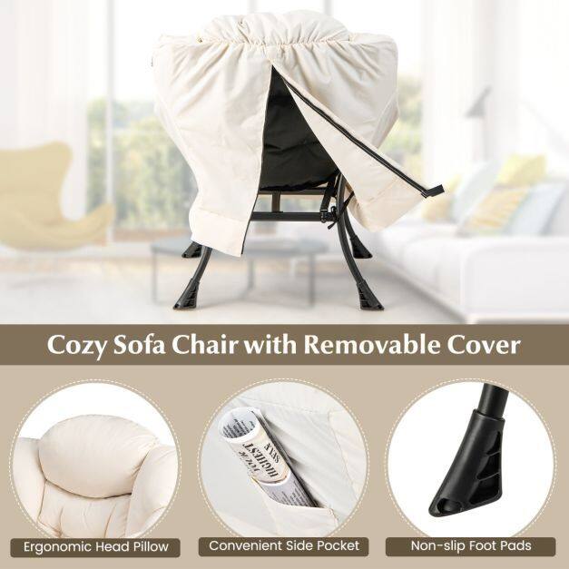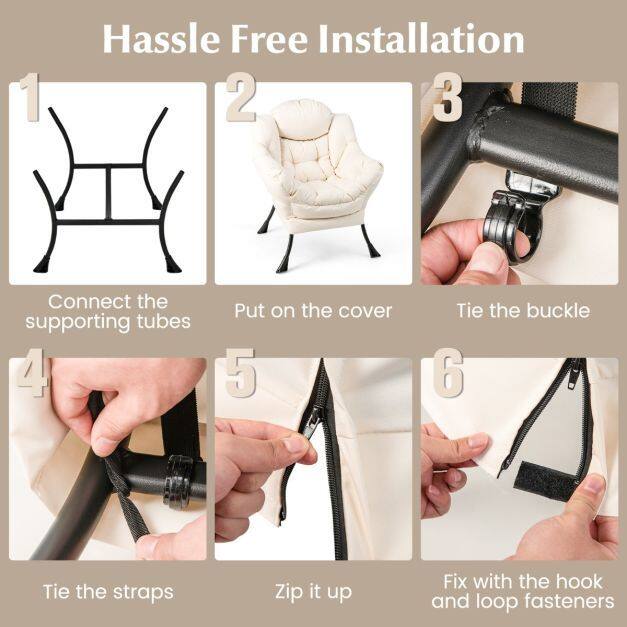 ● Easy Assembly in 6 Steps: The leisure sofa chair with footrest is easy to assemble by the following steps: 1. Connect the supporting tubes; 2. Place the cover on; 3. Tie the buckle; 4. Zip up the cover; 5. Fix with the hook and loop fasteners; 6. Secure with fixing straps.