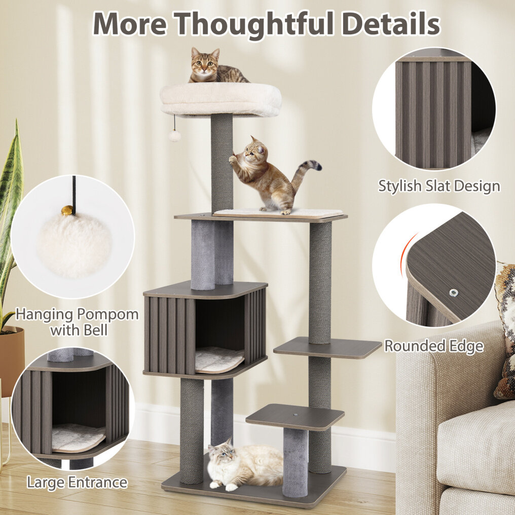 This spacious, fence-style cat tree provides a cozy haven for lounging and hiding, while the wide top perch, with thick sponge padding, offers a luxurious space for relaxing and observing. Designed for easy maintenance, the removable cushions are ideal for any season, and the smooth top surface ensures easy cleaning. With 6 levels for climbing and exploring, this compact cat tree maximizes vertical space while fitting neatly into every nook and cranny, making it perfect for small apartments. Additionally, the sturdy scratching posts promote paw care, and the playful hanging pompom with its bell satisfies your cat's natural instincts: to scratch, stretch, and hunt. Give your cat the perfect balance of comfort, fun, and practicality with this thoughtfully designed cat furniture!