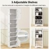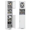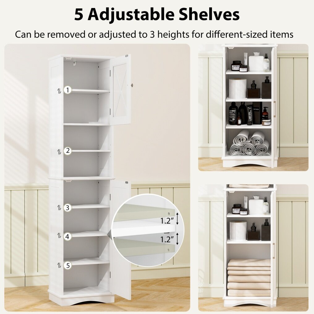 Featuring 2 open compartments and 2 enclosed cabinets, it offers ample space for your daily essentials. The floor cabinet also includes 5 adjustable and removable shelves, allowing for customization to fit items of various sizes. Crafted from premium acrylic panel and MDF with water-resistant paint, it ensures long-lasting durability. Additionally, the anti-toppling device enhances stability and safety. Its compact design effortlessly fits into narrow corners, making it ideal for bathrooms, living rooms, kitchens, home offices, and more. Upgrade your space with this practical corner floor cabinet.