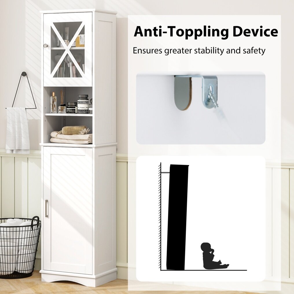 Reliable Construction: Crafted from premium acrylic panel and MDF with water-resistant paint, the bathroom floor cabinet is built to last. Additionally, the anti-toppling device provides greater stability and safety, preventing accidental falls for worry-free use.